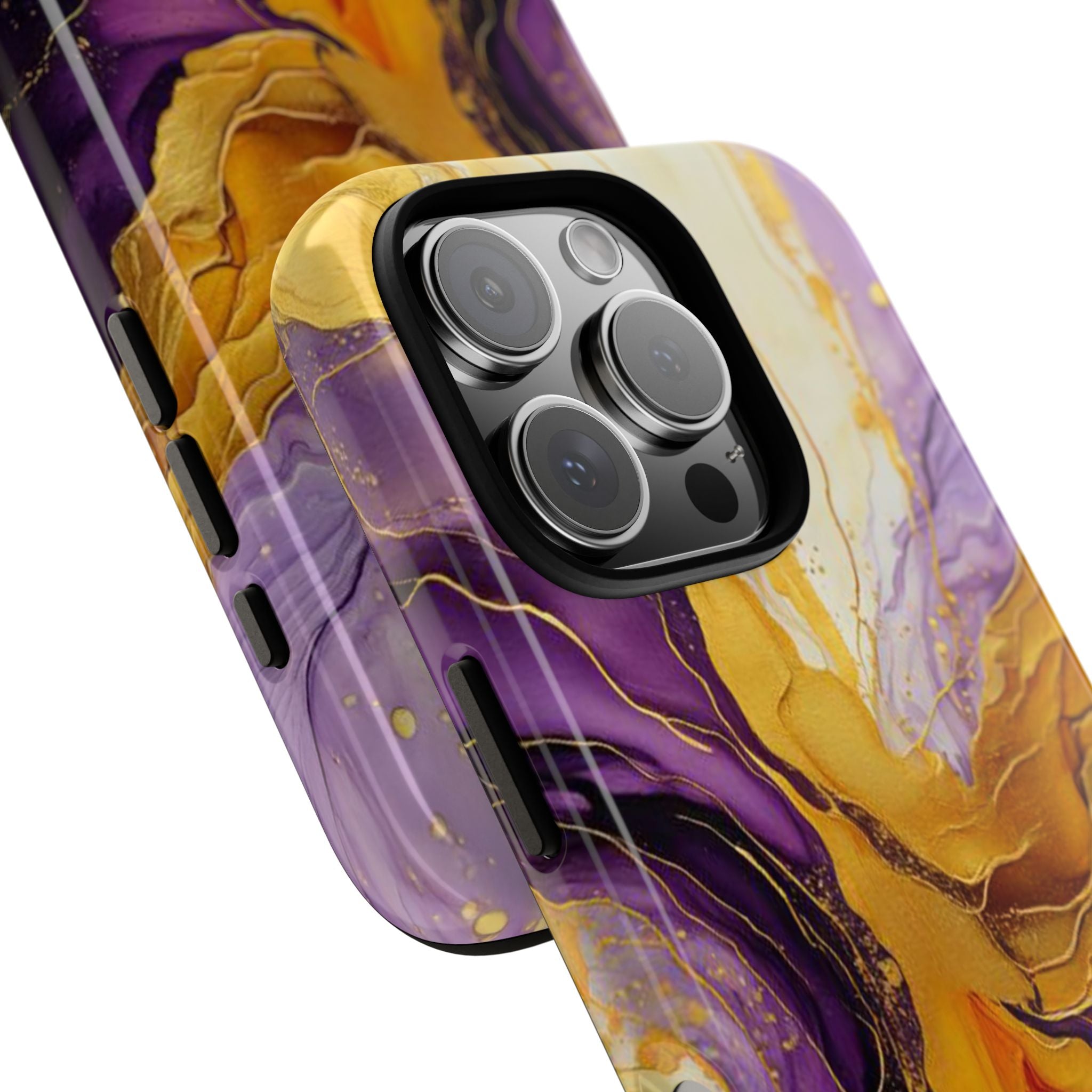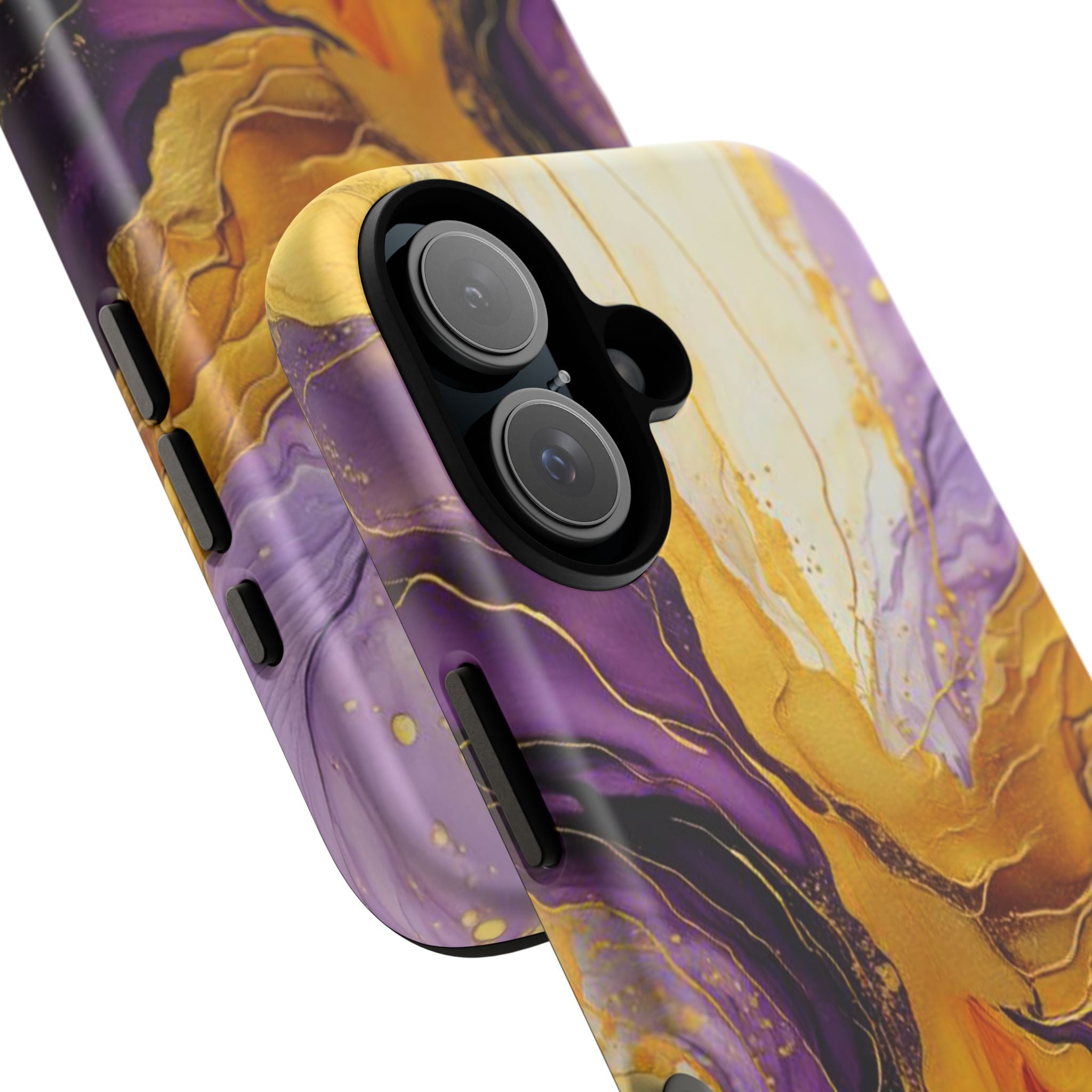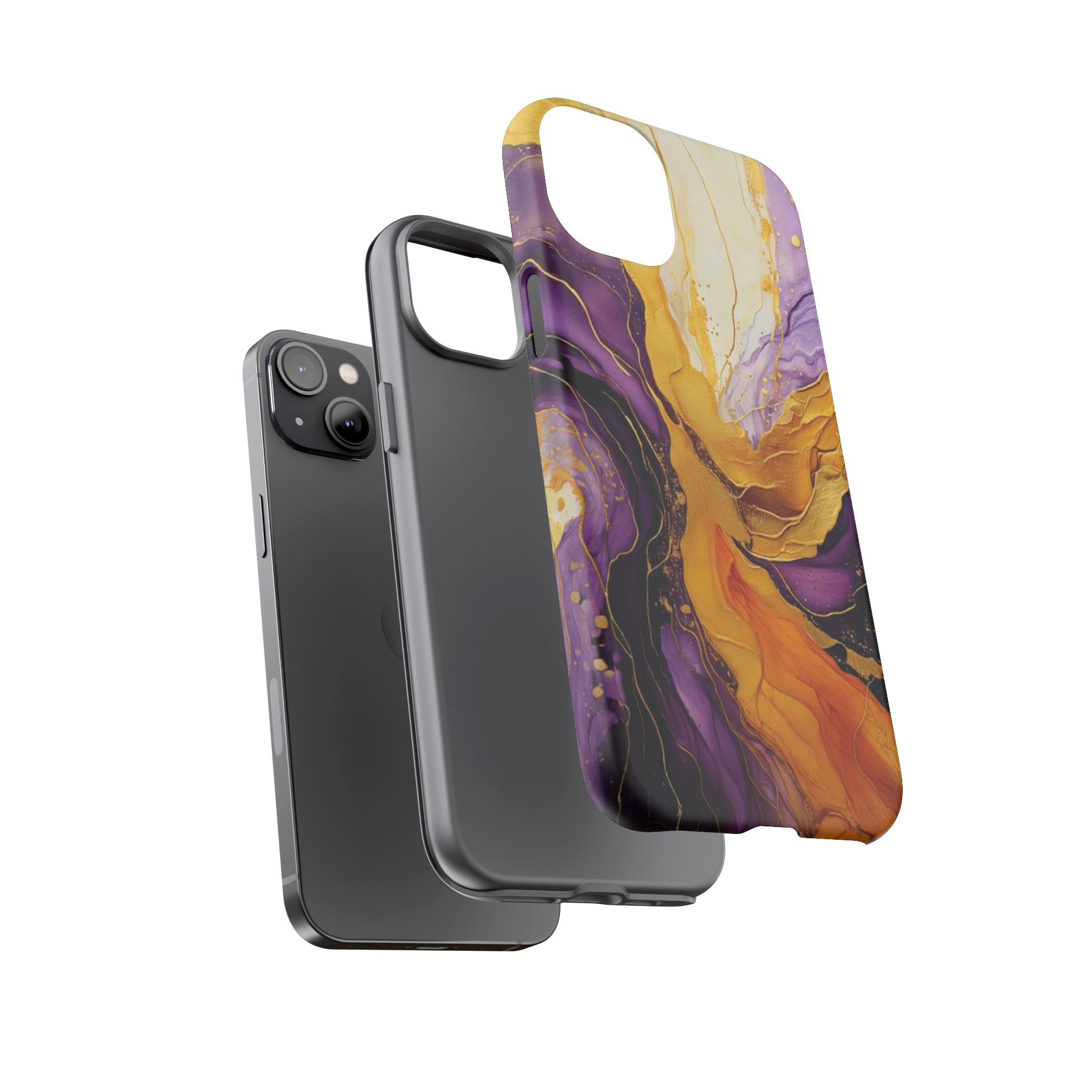 Experience the ultimate phone protection with the Tough Case - Gratitude. This beautiful case features an abstract design of deep violet and golden yellow swirls. The rich hues and flowing patterns evoke a sense of appreciation and joy, making it a meaningful reminder of life's blessings.The design extends around the entire case and is sure to make a statement while protecting your phone with style.