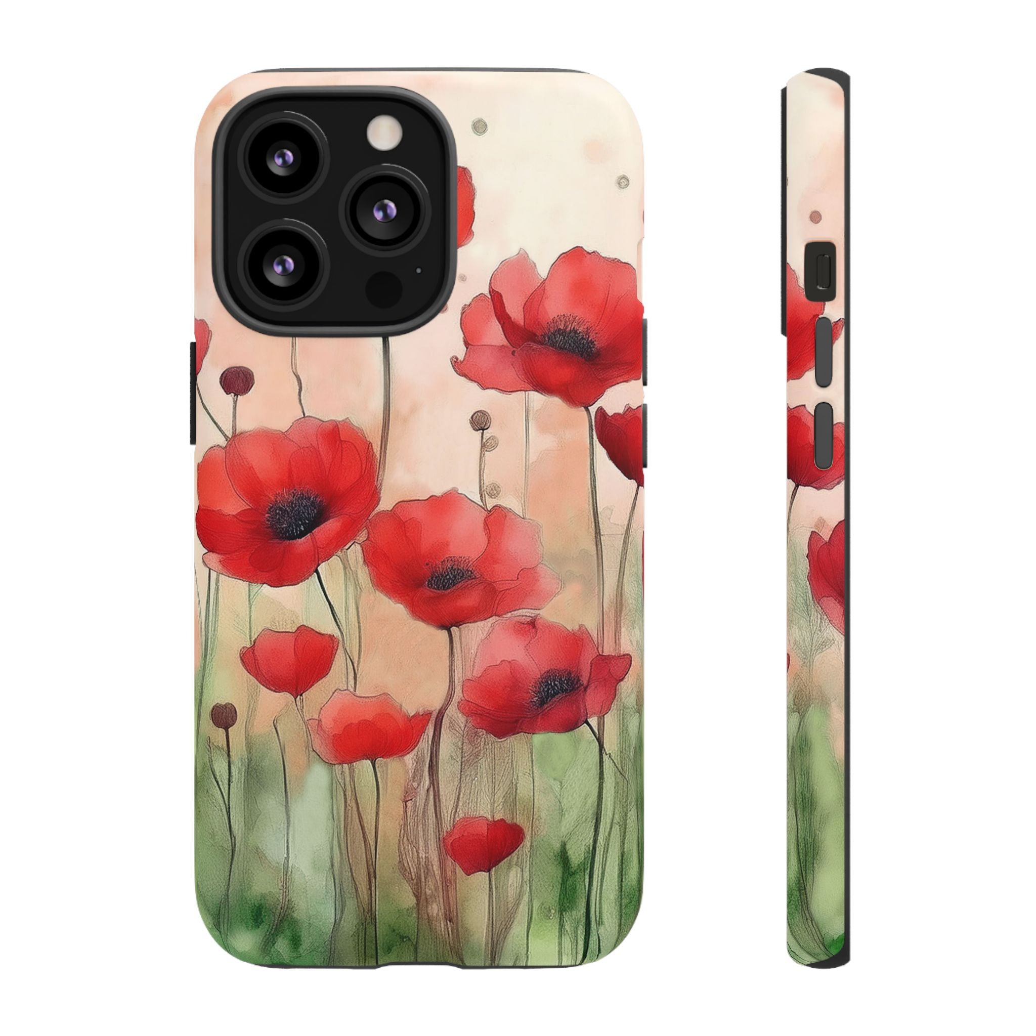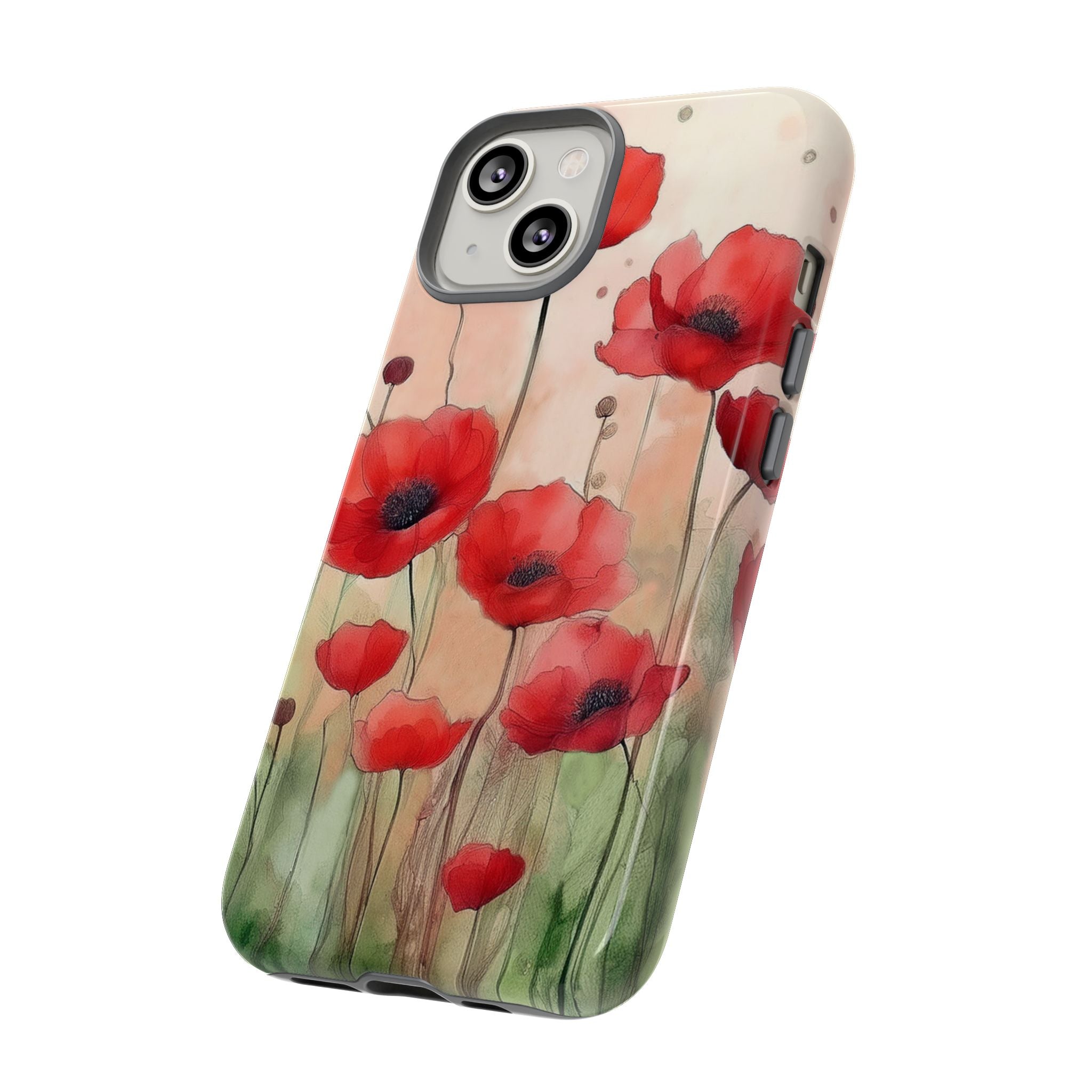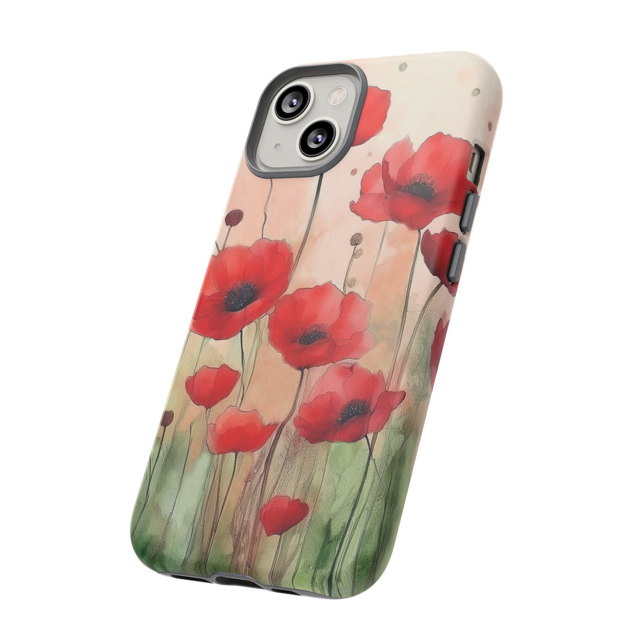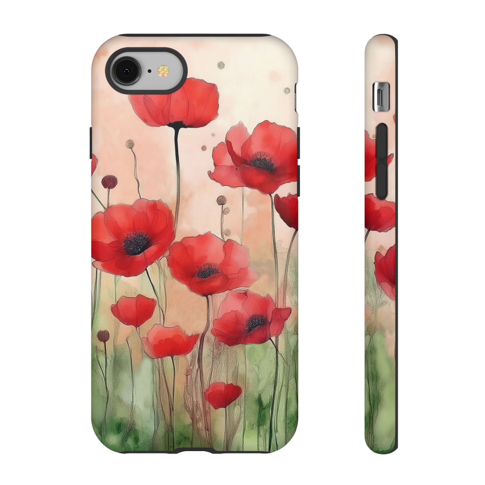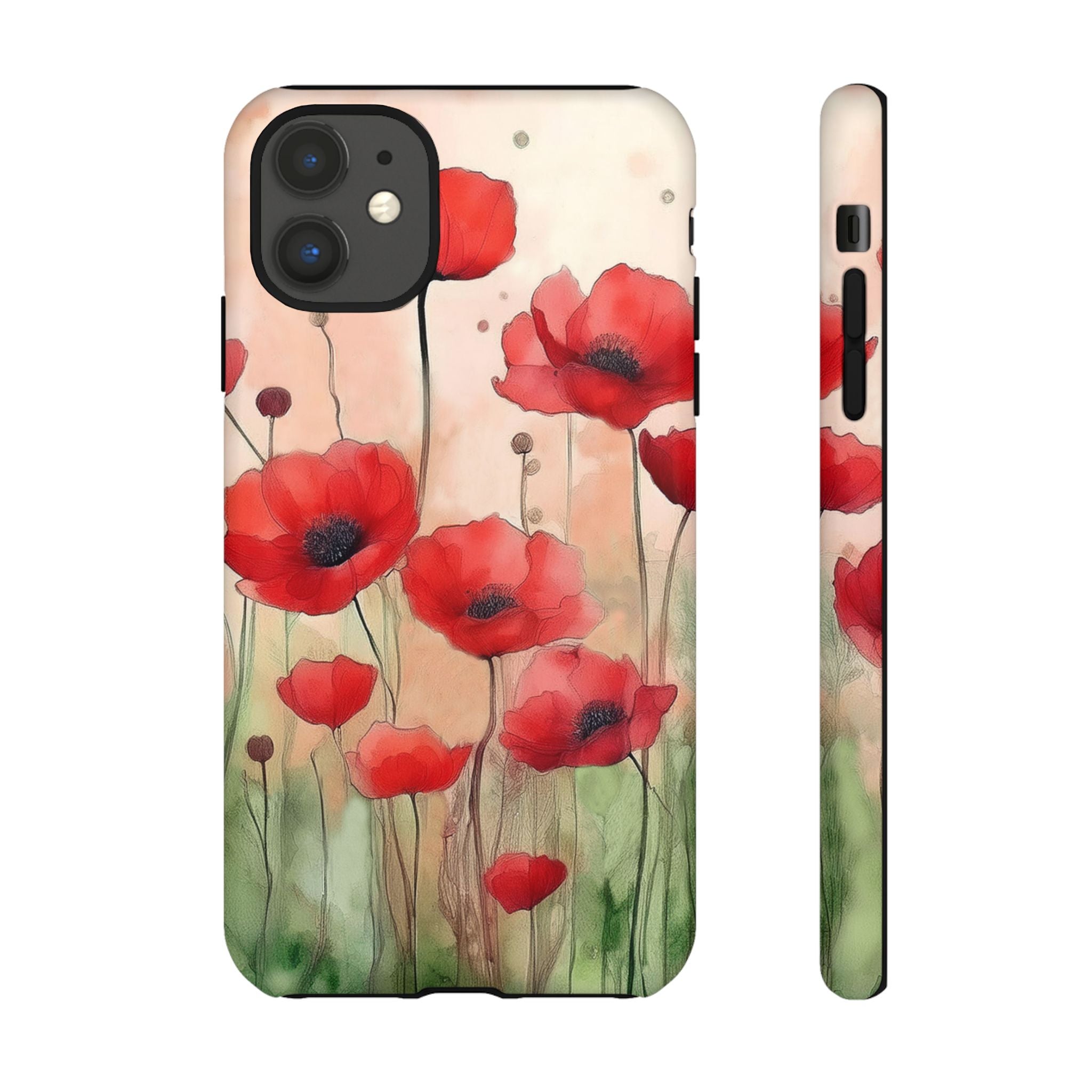 Experience the ultimate phone protection with the Tough Case - Winter. This beautiful case features a stunning watercolor design of vibrant red poppies flourishing in an open field, evoking the contrasting beauty of nature in winter. The design extends around the entire case and is sure to make a statement while protecting your phone with style.