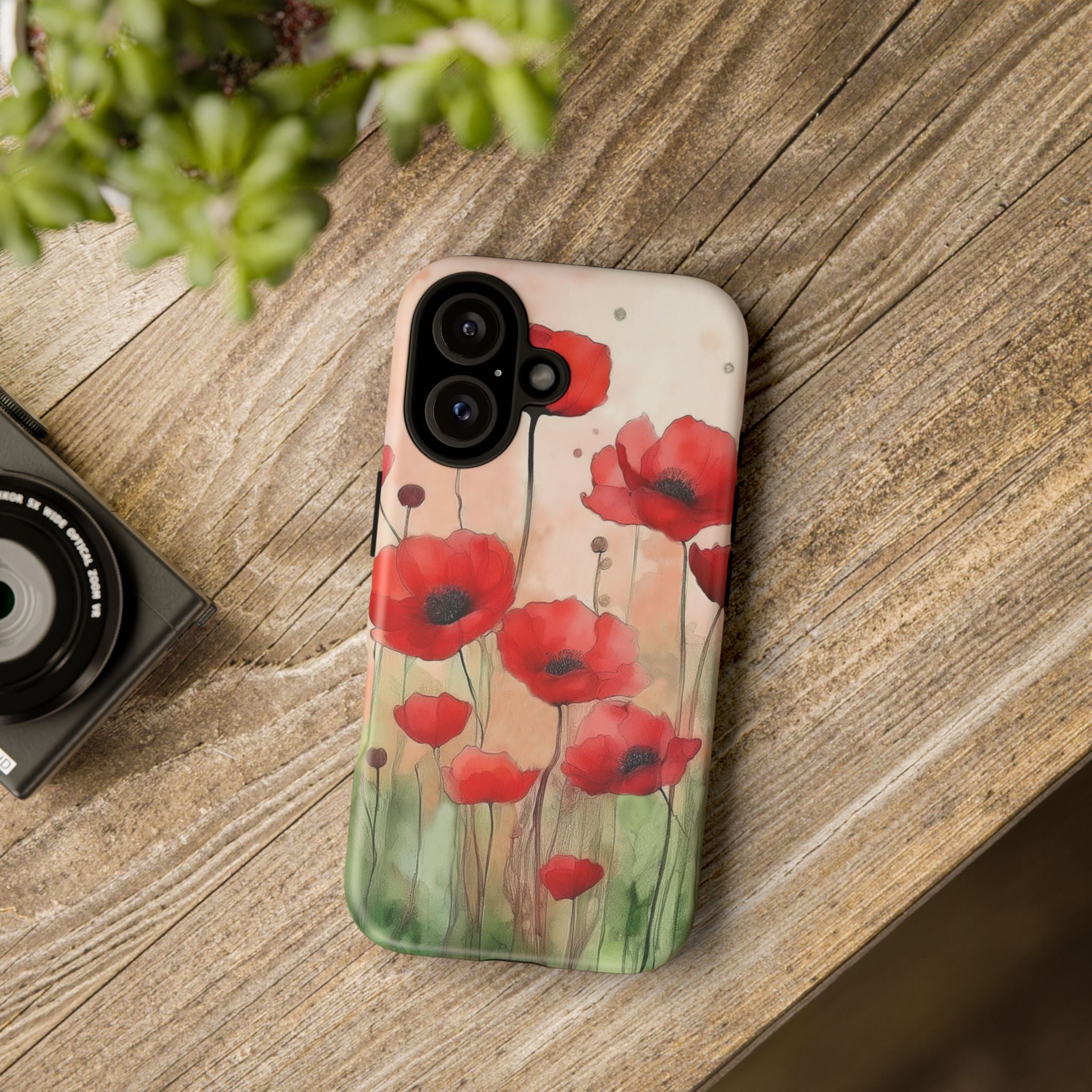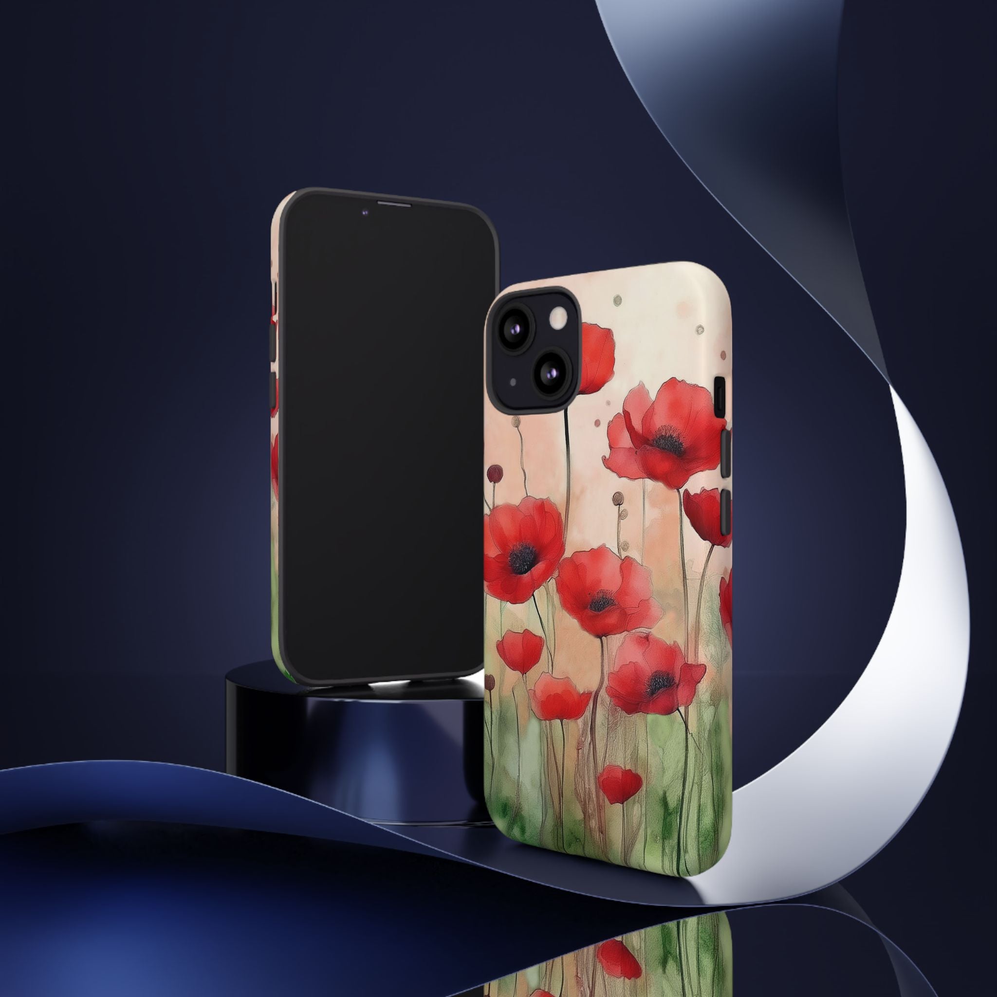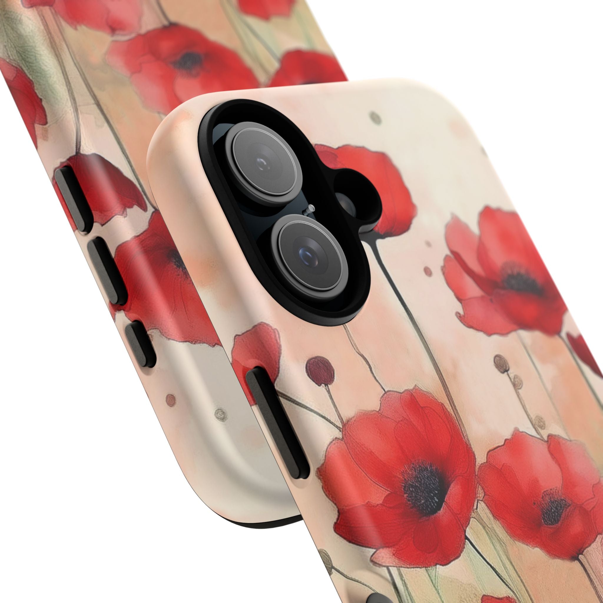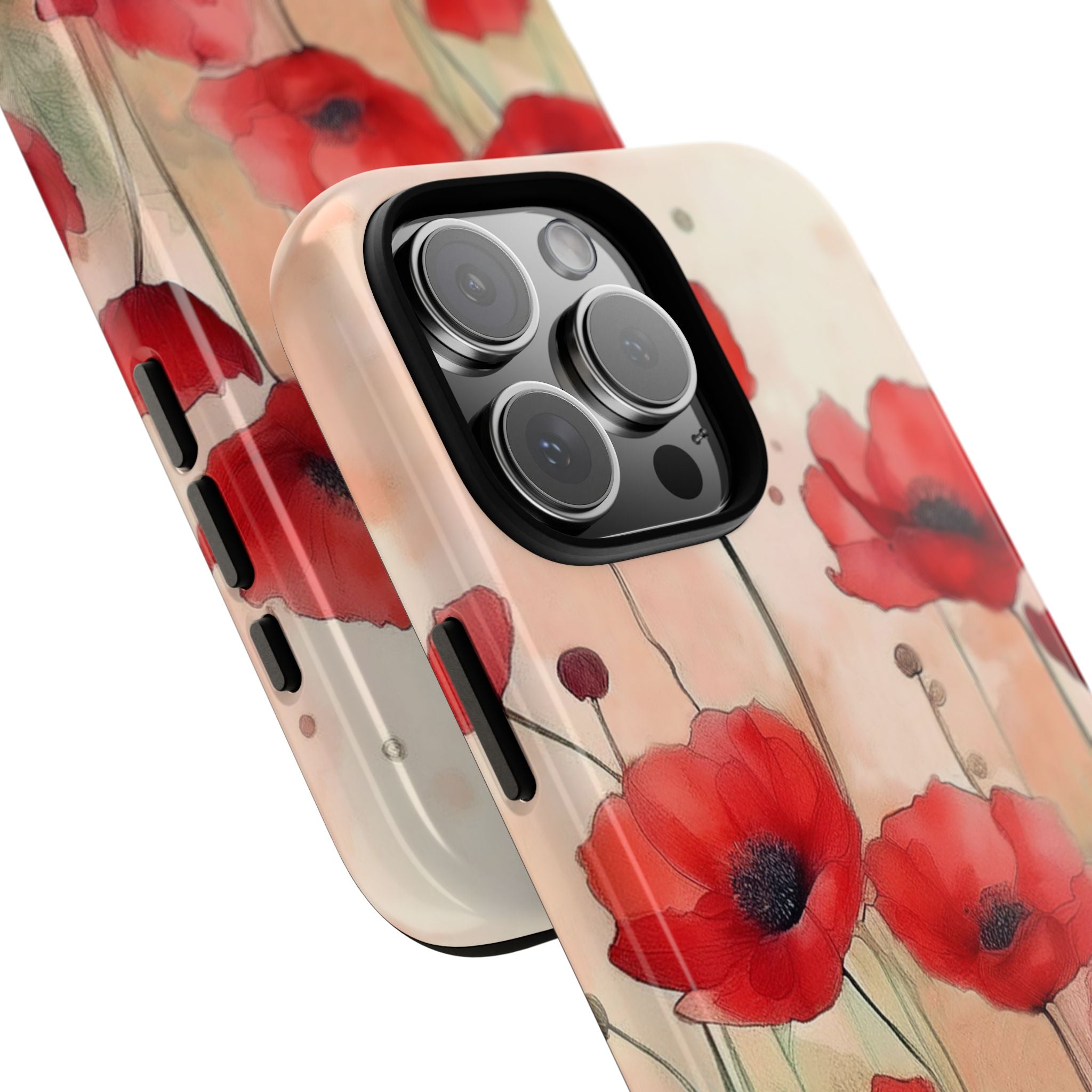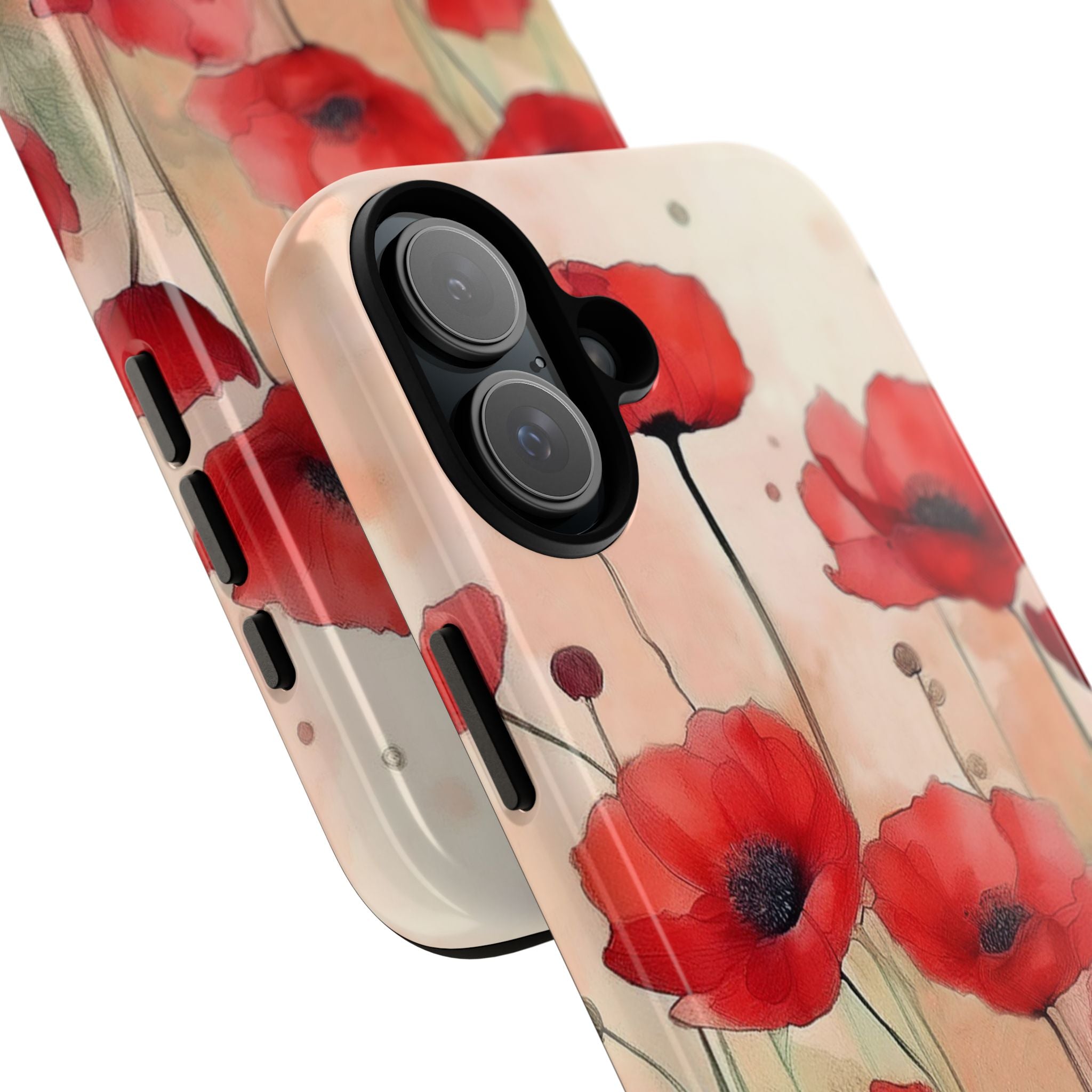 Experience the ultimate phone protection with the Tough Case - Winter. This beautiful case features a stunning watercolor design of vibrant red poppies flourishing in an open field, evoking the contrasting beauty of nature in winter. The design extends around the entire case and is sure to make a statement while protecting your phone with style.