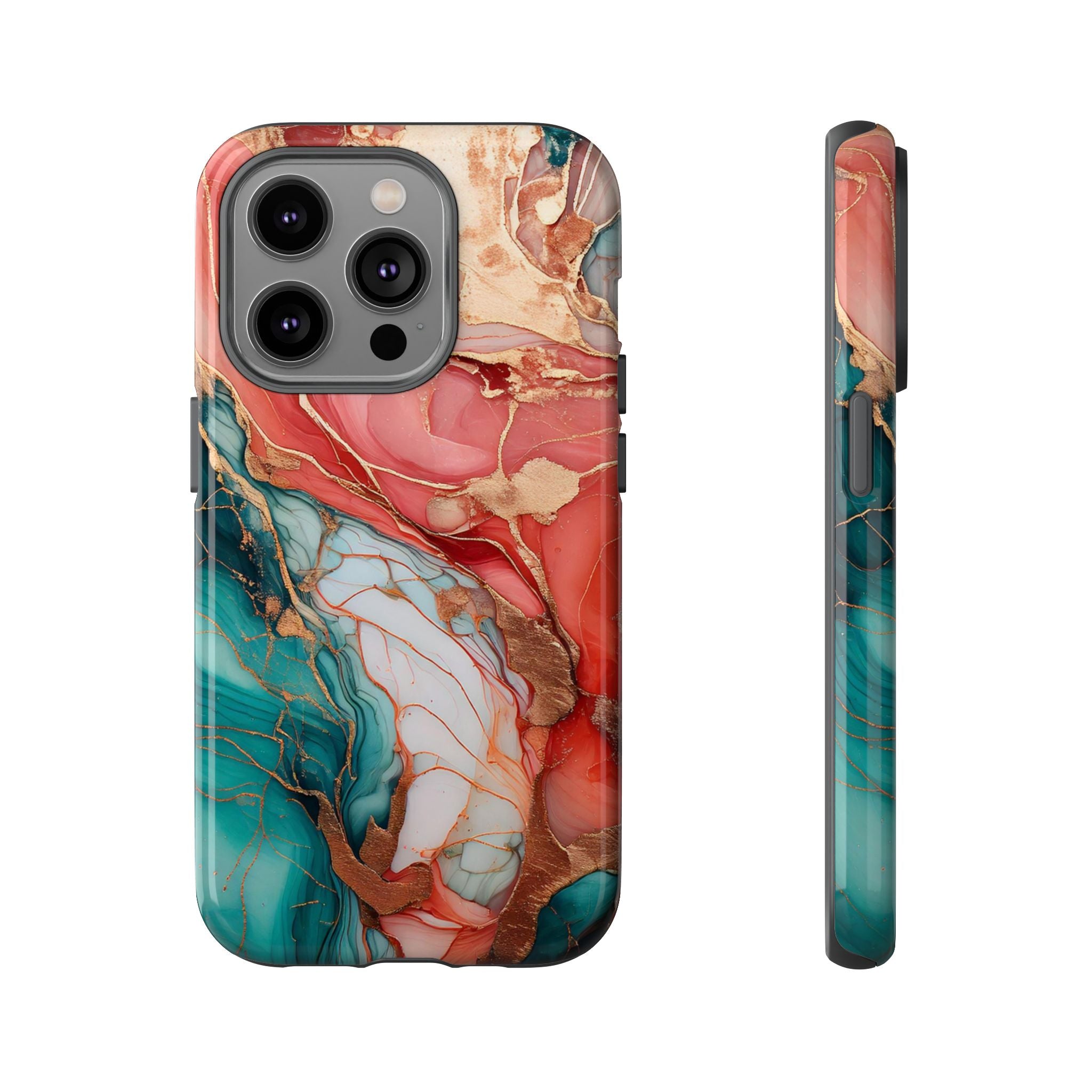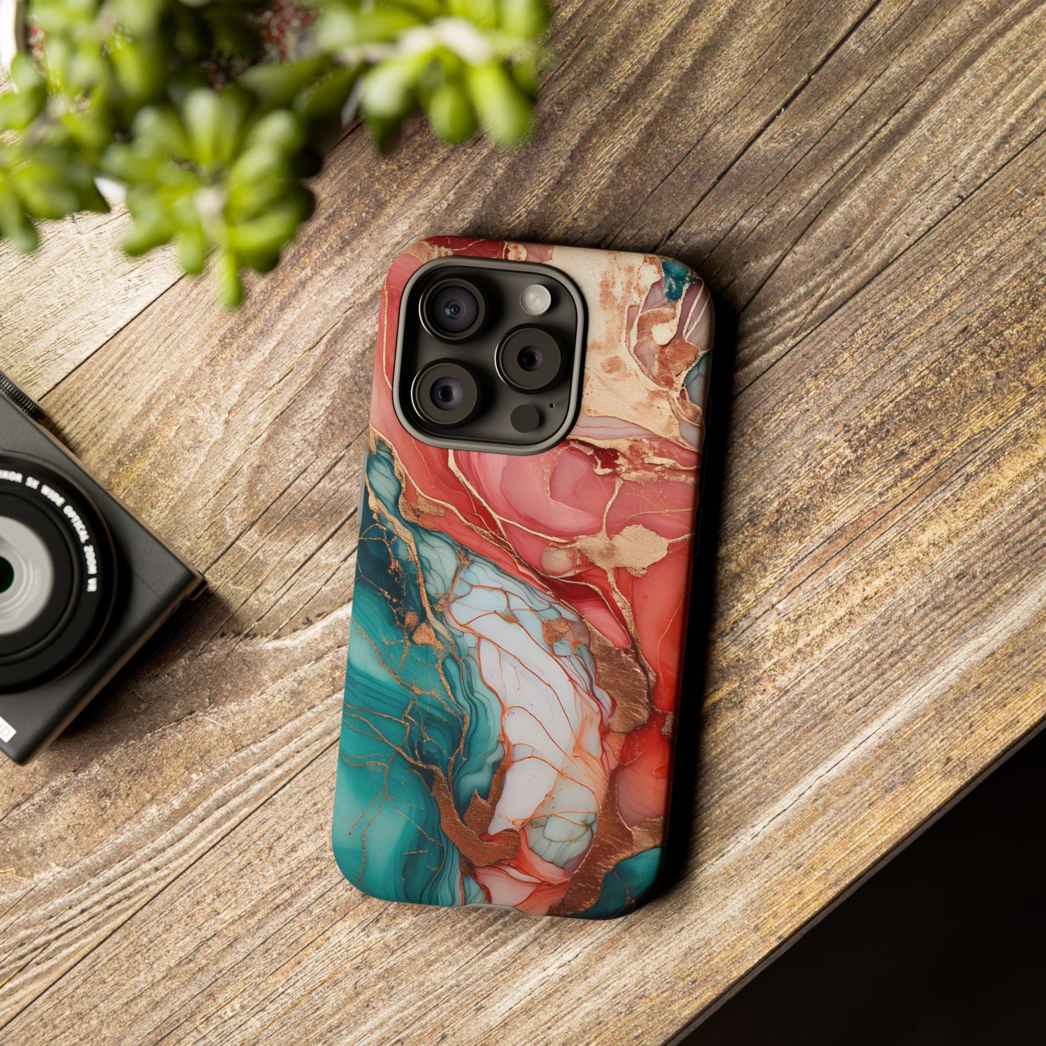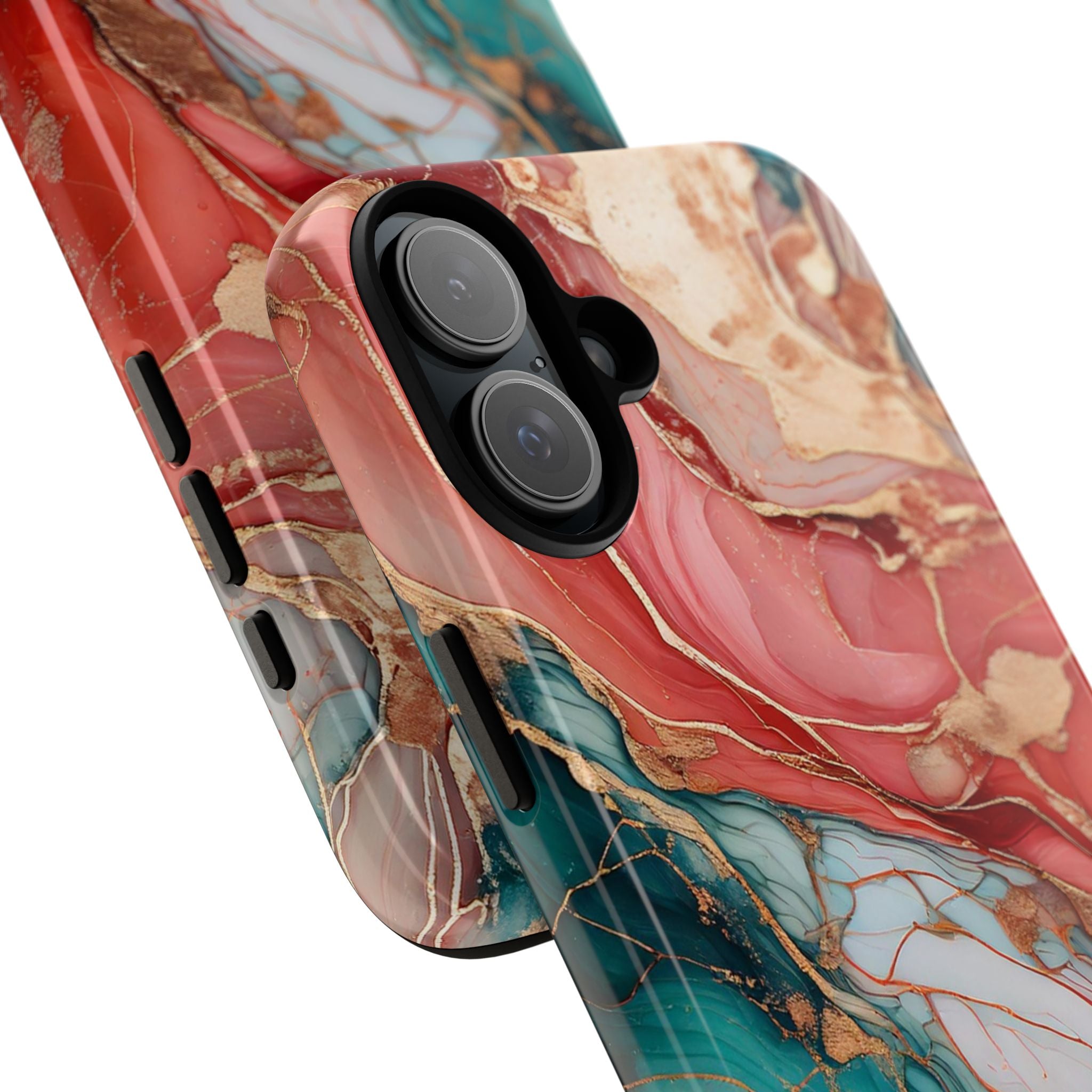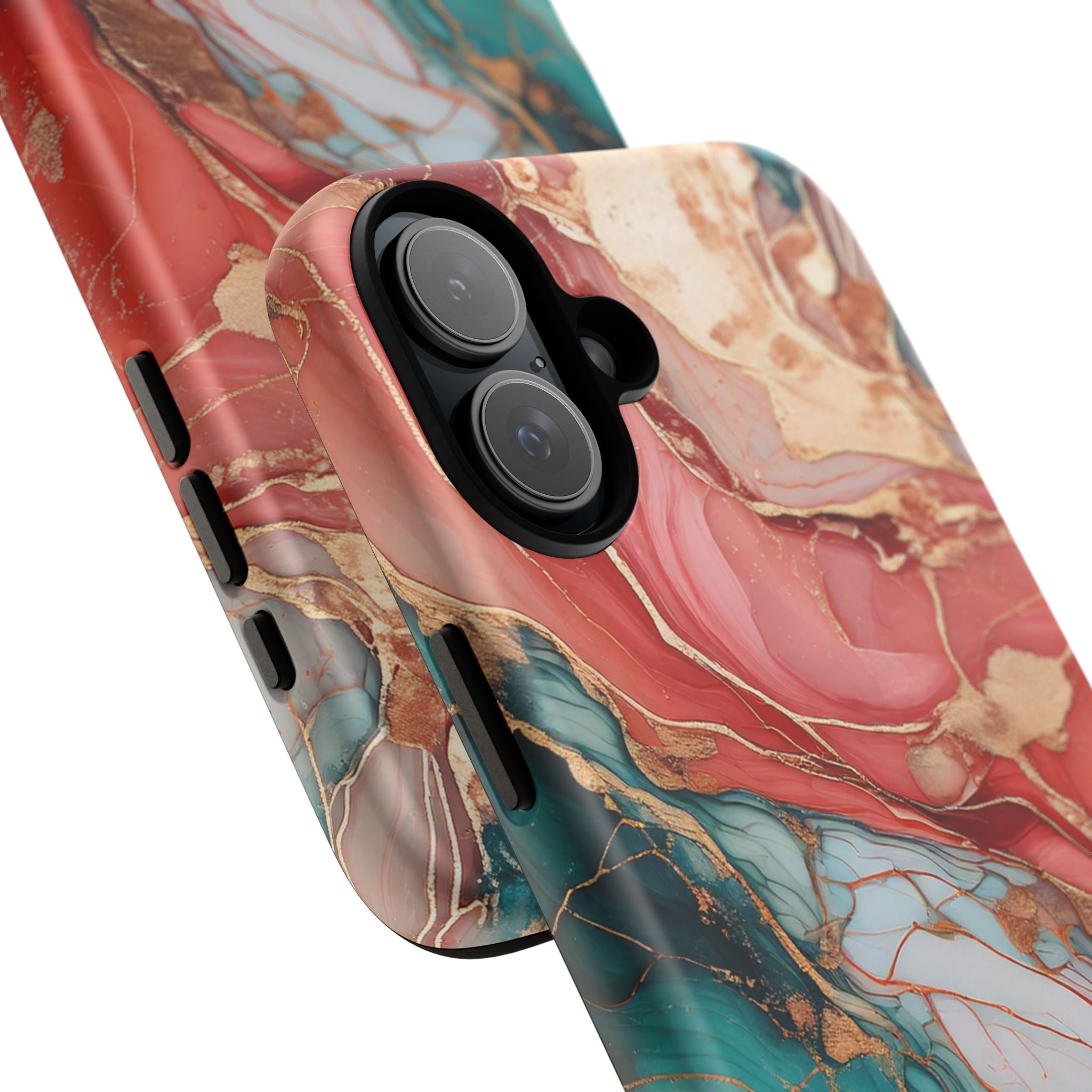 Experience the ultimate phone protection with the Tough MagSafe Case - Kindness. This beautiful case features a stunning marbled design in rich shades of salmon, teal and gold. Delicate veins of gold weave through the pattern like threads evoking the small acts of kindness that have the potential to pull the world together. The design extends around the entire case and is sure to make a statement while protecting your phone with style.