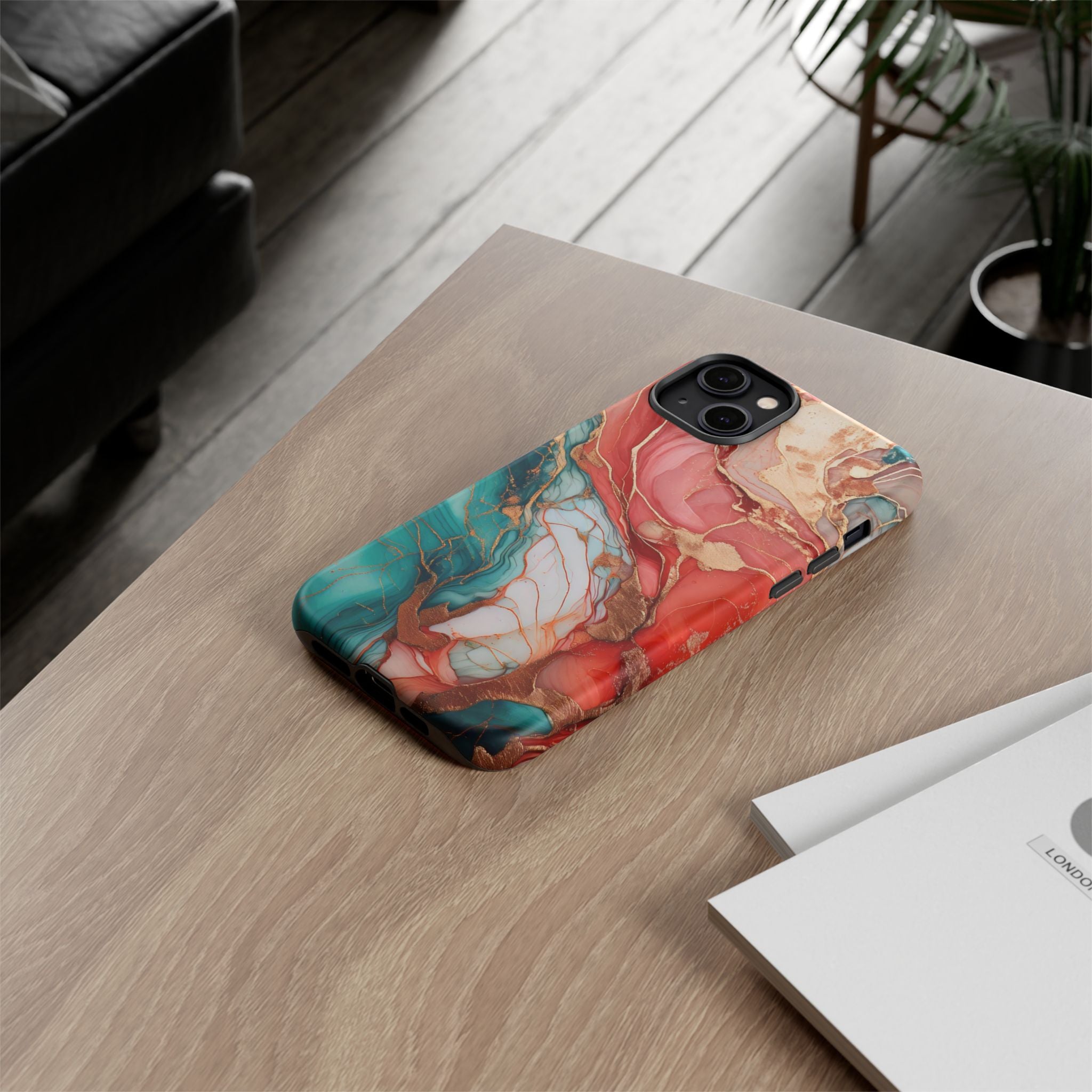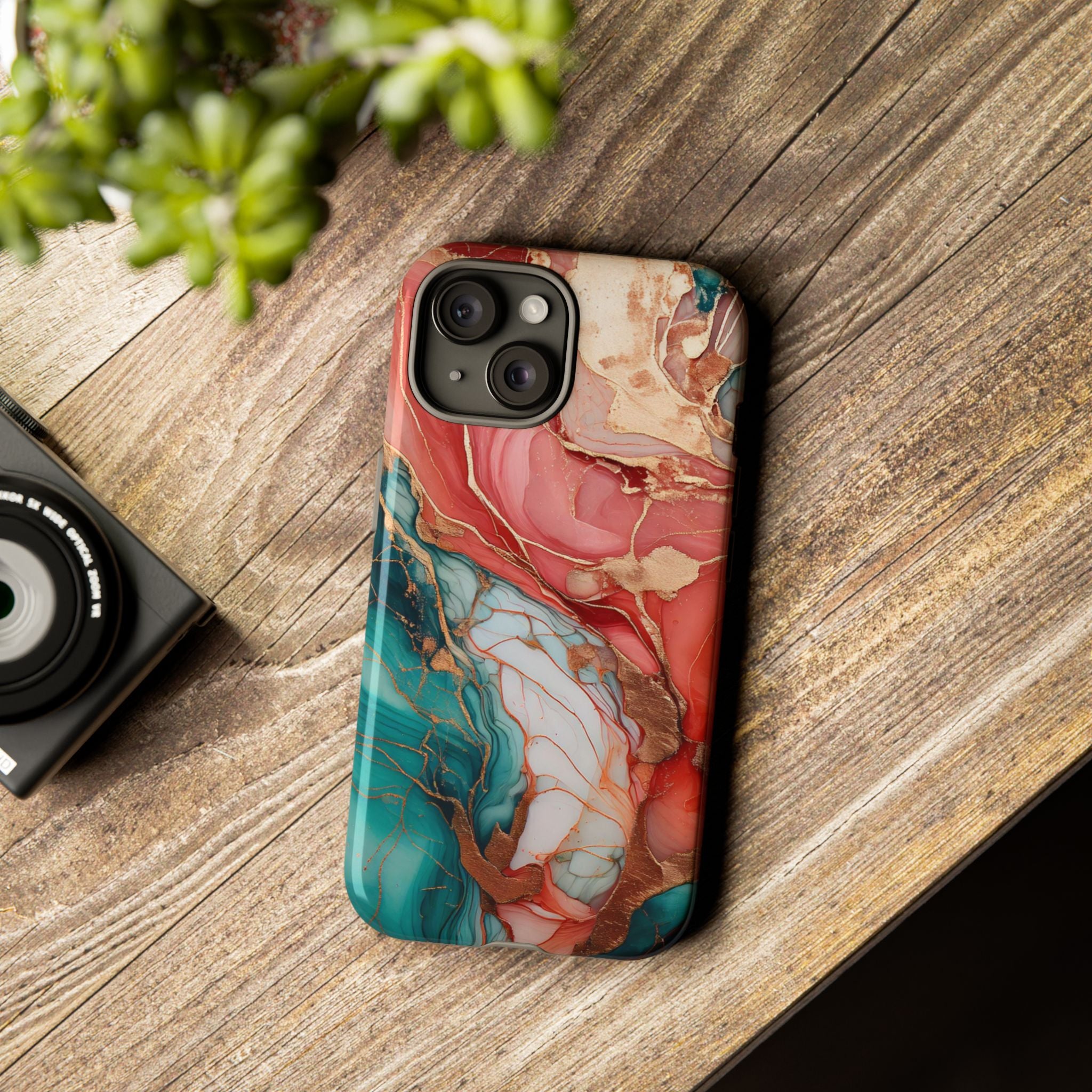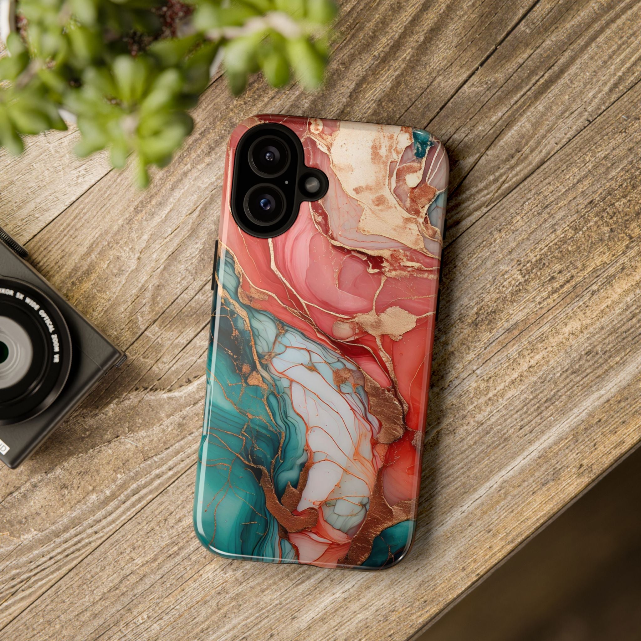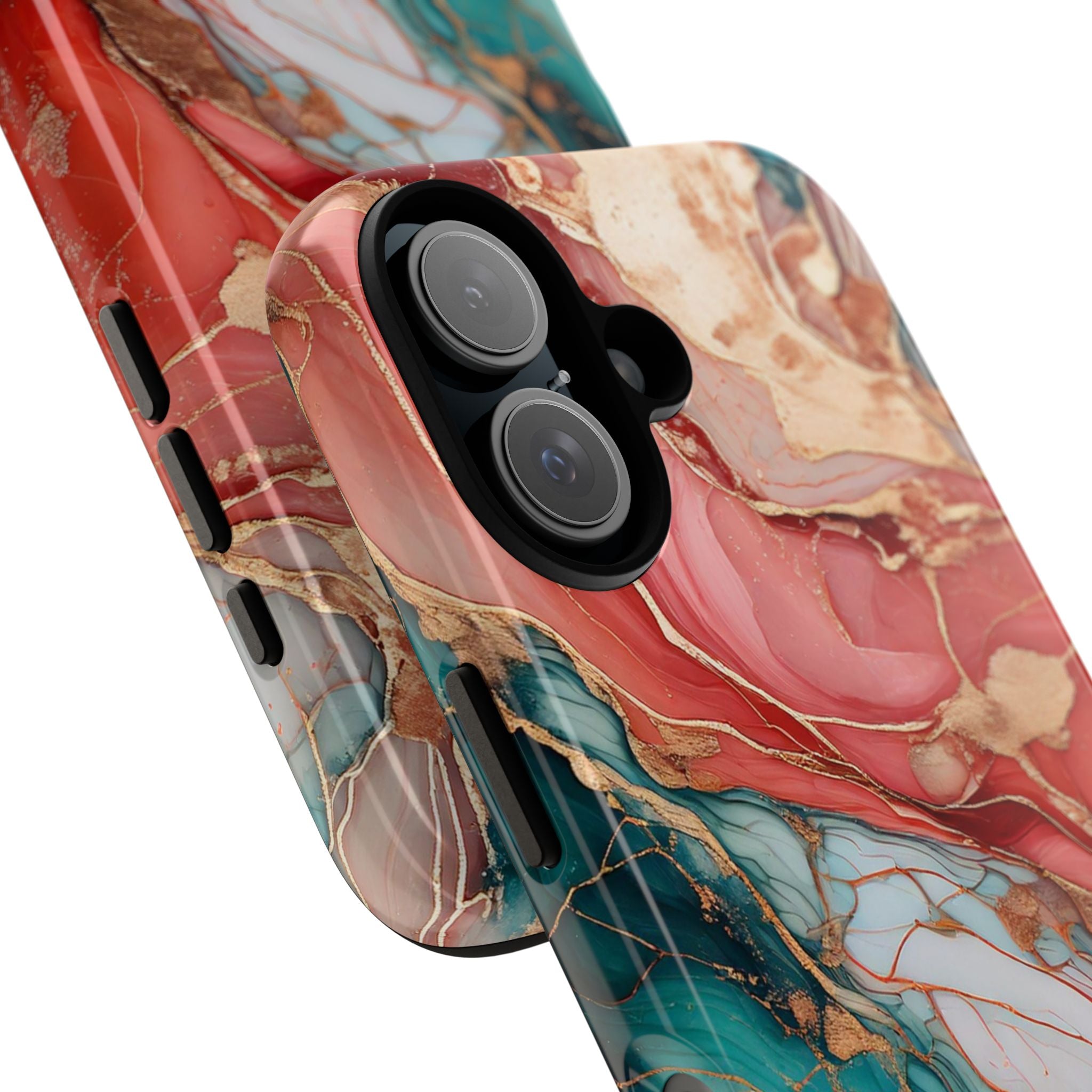 Experience the ultimate phone protection with the Tough MagSafe Case - Kindness. This beautiful case features a stunning marbled design in rich shades of salmon, teal and gold. Delicate veins of gold weave through the pattern like threads evoking the small acts of kindness that have the potential to pull the world together. The design extends around the entire case and is sure to make a statement while protecting your phone with style.