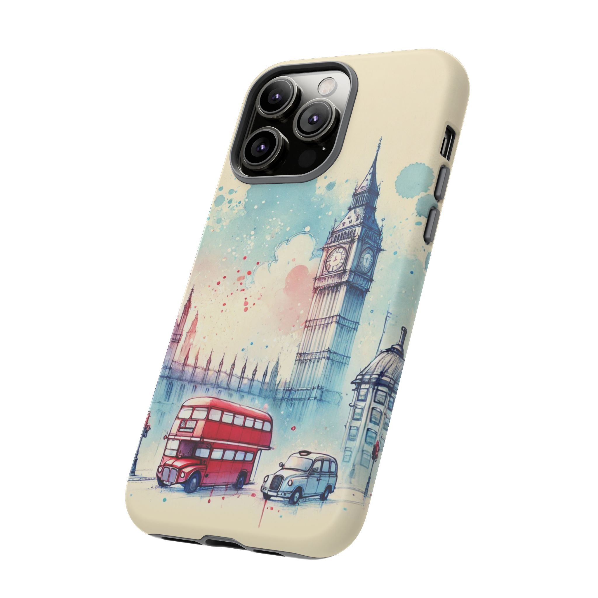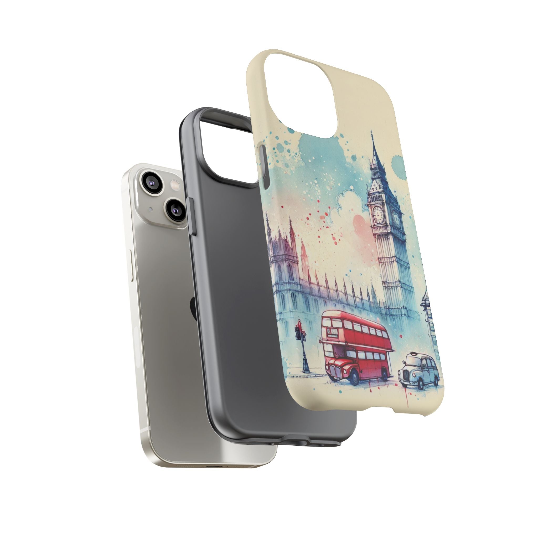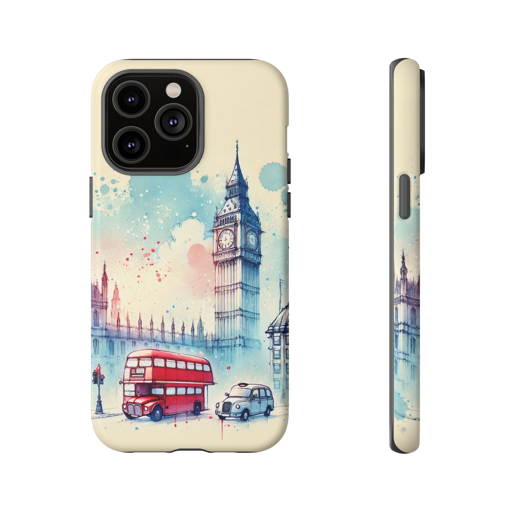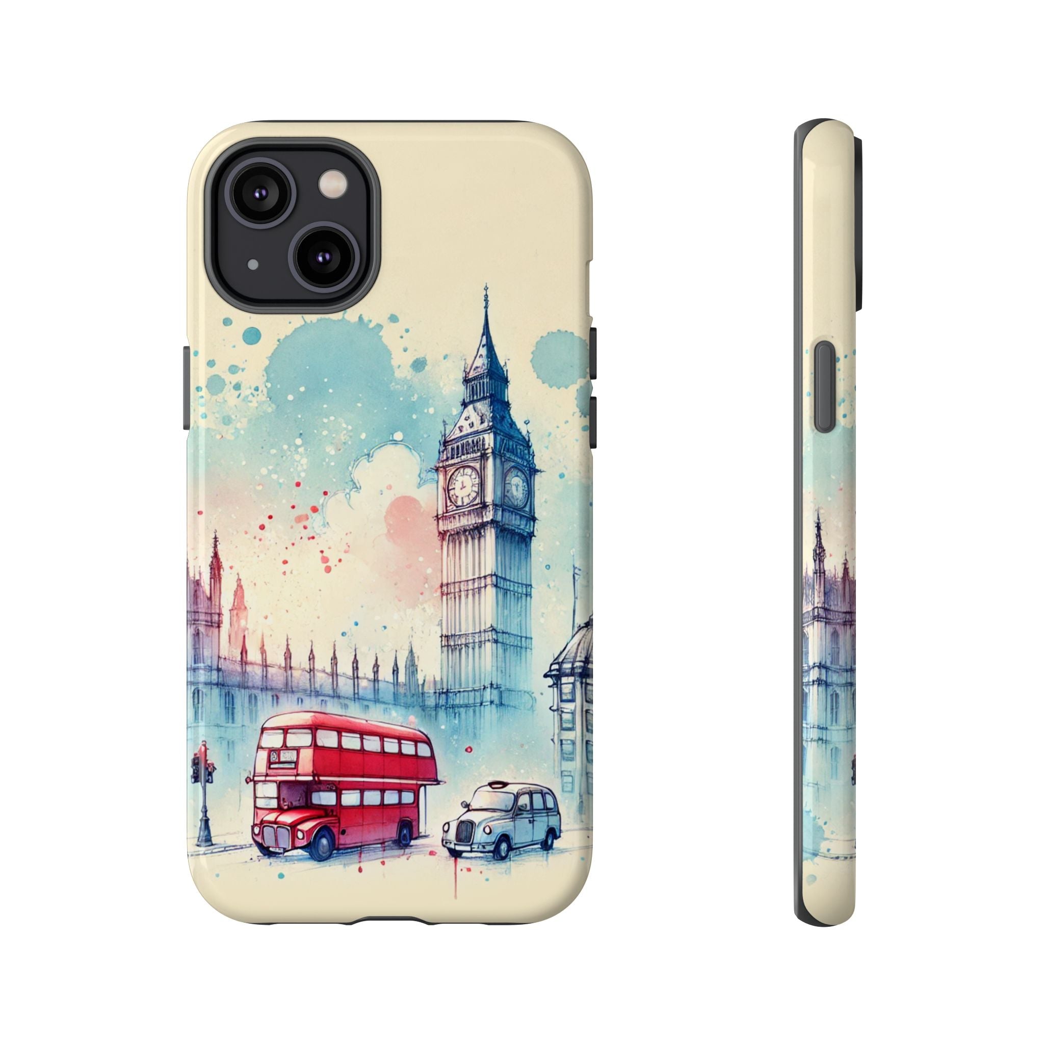 Experience the ultimate phone protection with the Tough MagSafe Case - London. This beautiful case features a stunning watercolor and ink design of London, showcasing the iconic Big Ben and a classic red London bus, capturing the charm and timeless energy of this historic city. The design extends around the entire case and is sure to make a statement while protecting your phone with style.