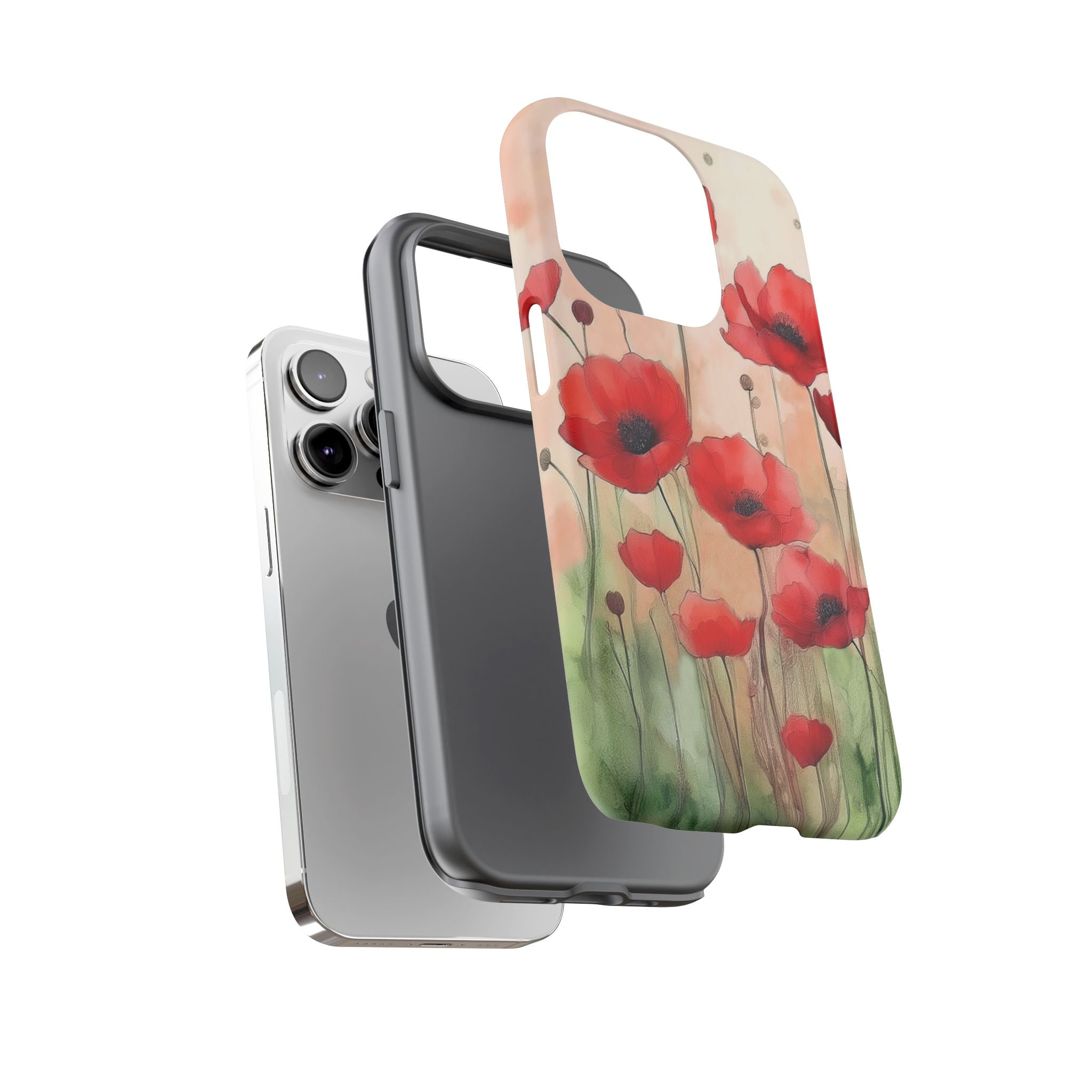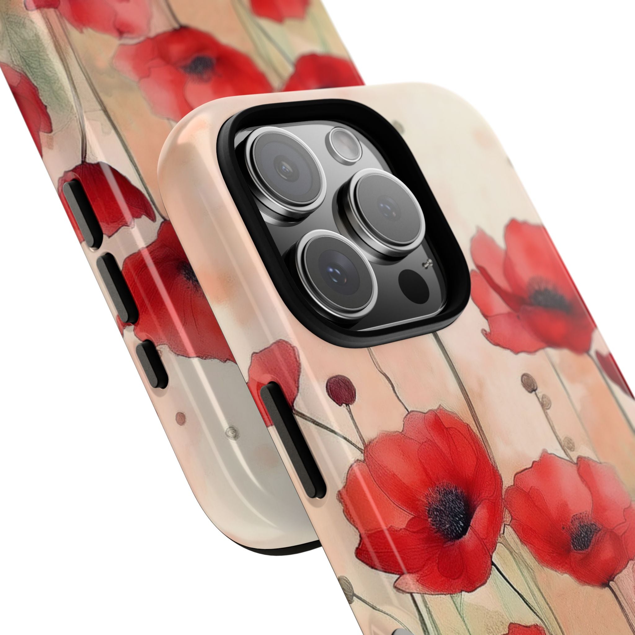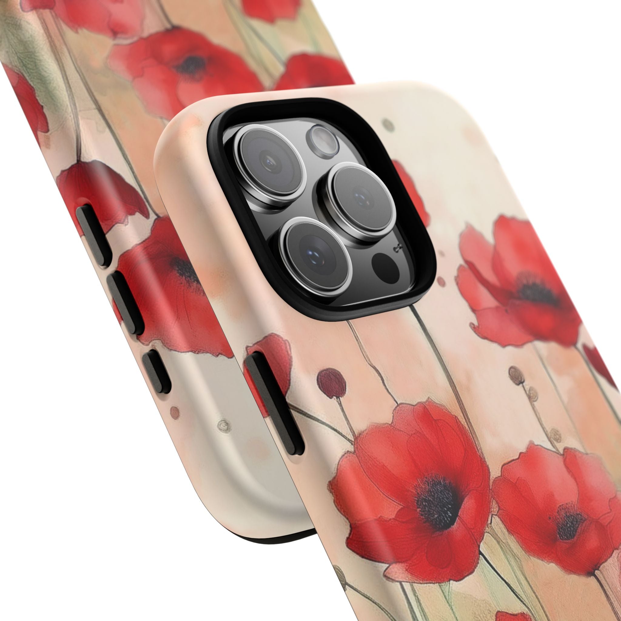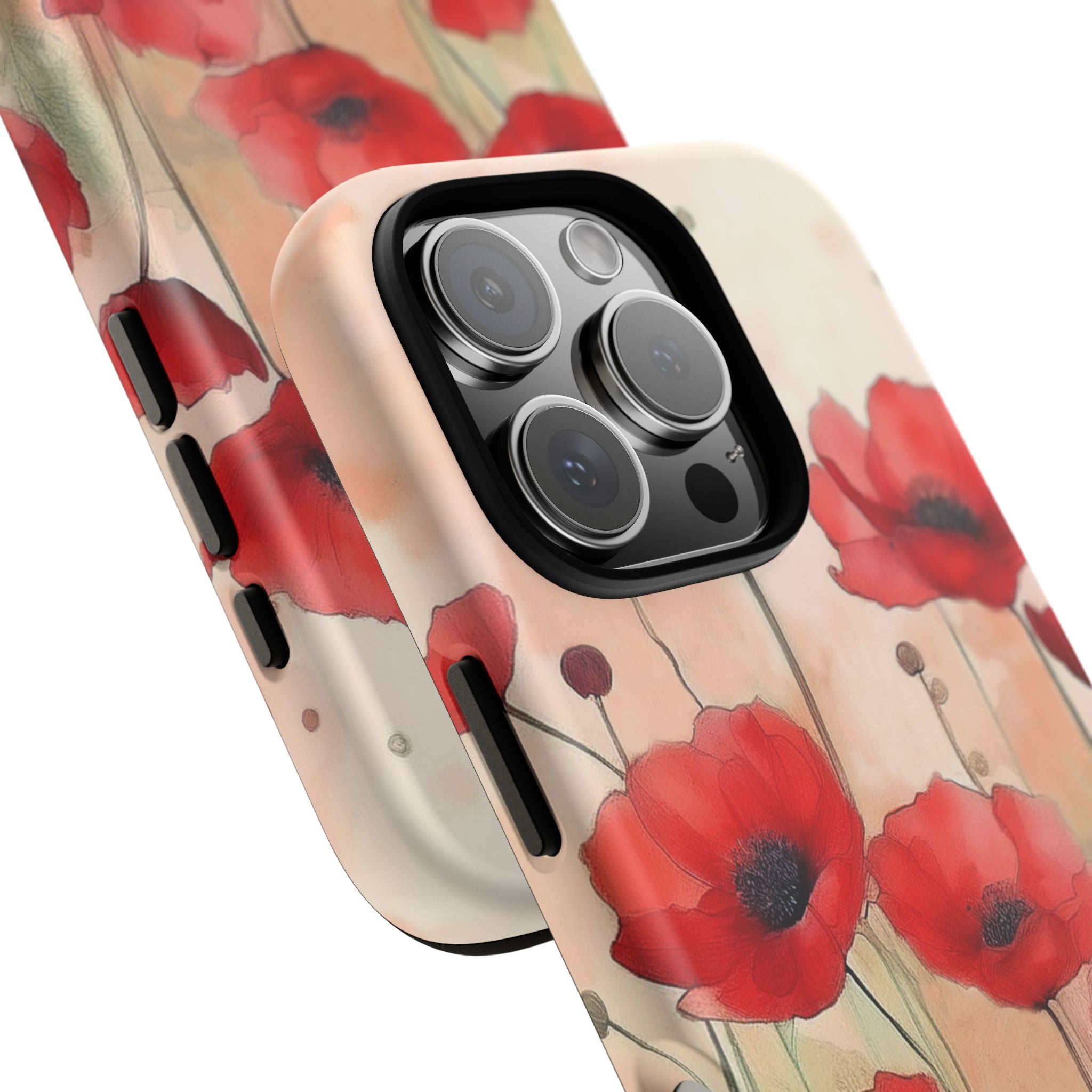 Experience the ultimate phone protection with the Tough MagSafe Case - Winter. This beautiful case features a stunning watercolor design of vibrant red poppies flourishing in an open field, evoking the contrasting beauty of nature in winter. The design extends around the entire case and is sure to make a statement while protecting your phone with style.