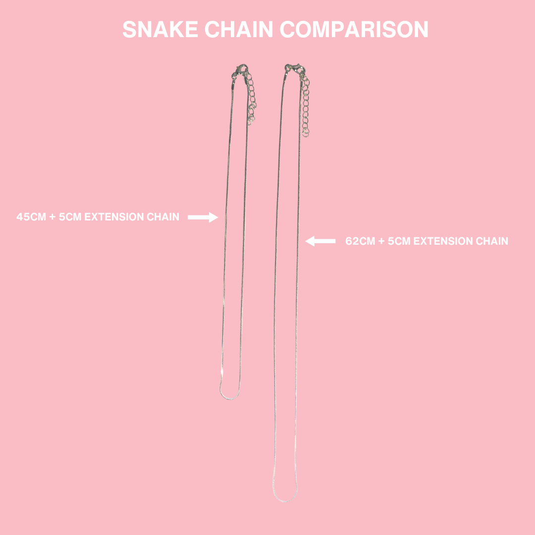 This delicate snake chain necklace is silver plated and is 2.1mm thick and 62cm long with a 5cm extension chain (67cm in total length).