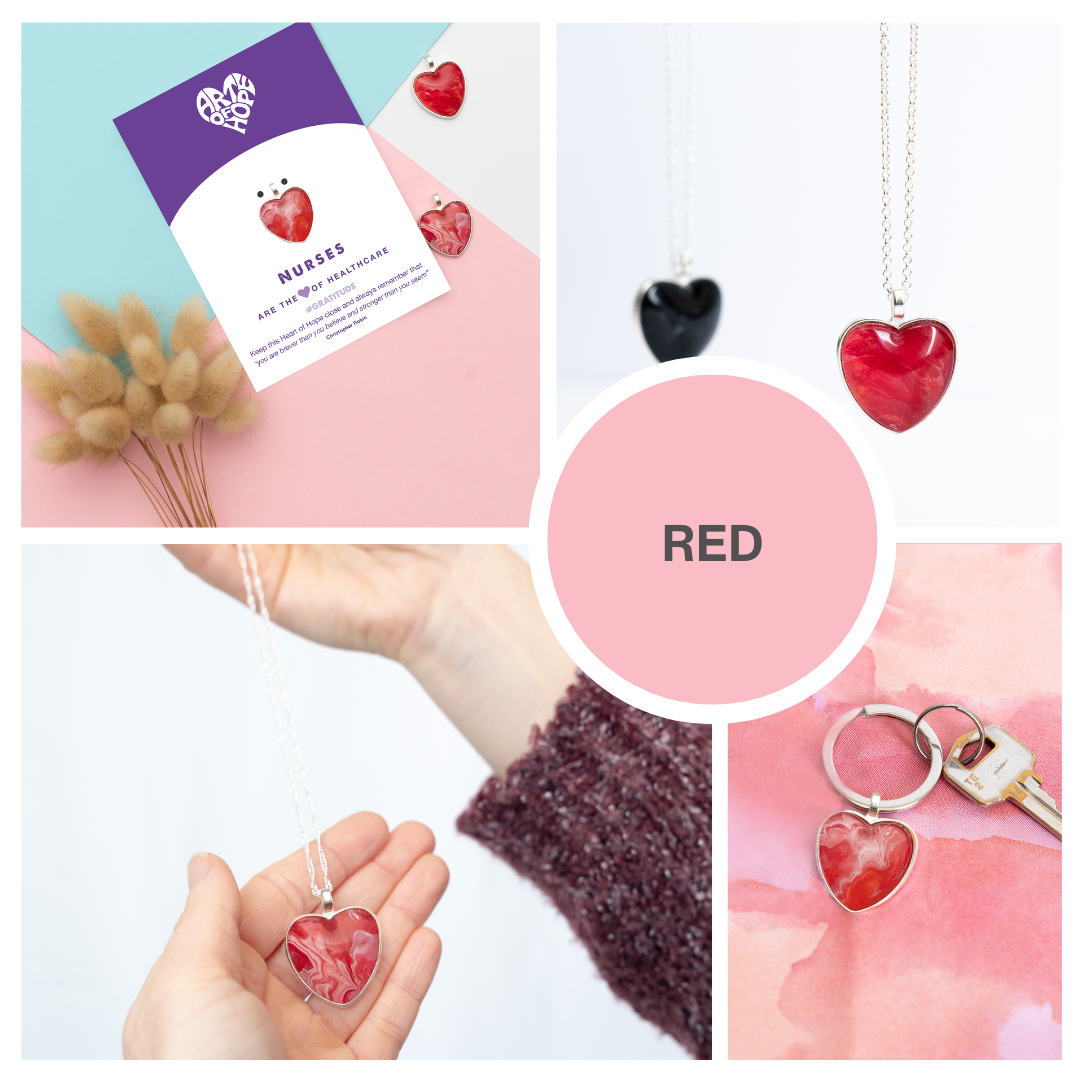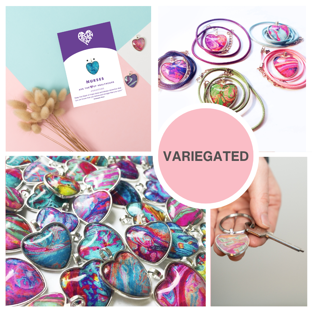 The hearts are made with love and care in our Sydney studio and each one is attached to a card with a safety pin so they can be worn on uniforms, clothes and scrubs. They also include a keyring so they can be kept close on keys and bags. Each one is enclosed in a cellophane bag for protection and there is space at the back of the card for you to write a personal message. Our most popular hearts are the variegated ones which are a delightful mix of colours and shapes. If you prefer, individual colours are also available. Make your Heart of Hope extra special by adding a necklace - chain, wax or suede cord - a suede gift pouch or beautiful gift wrapping.