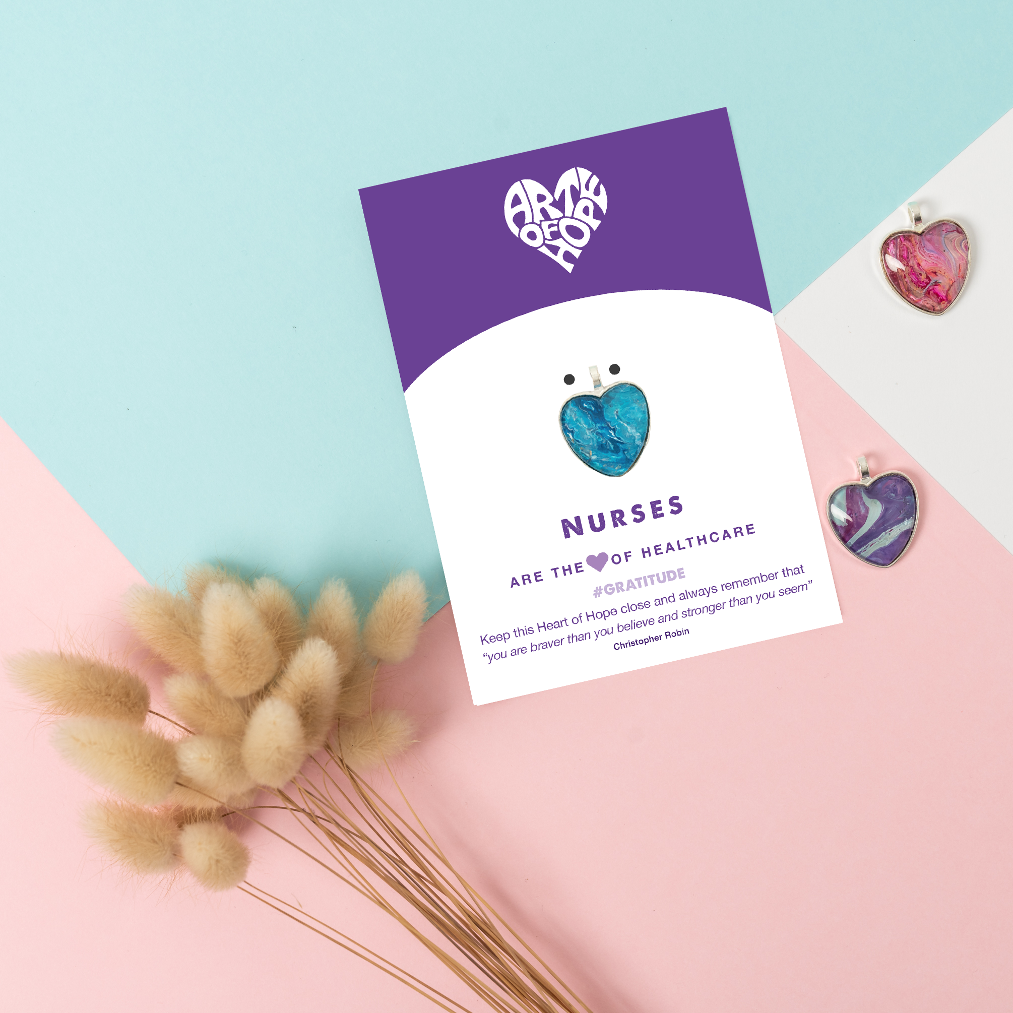 MESSAGE: "Nurses are the heart of healthcare. #gratitude. Keep this Heart of Hope close and always remember that "you are braver than you believe and stronger than you seem" Christopher Robin