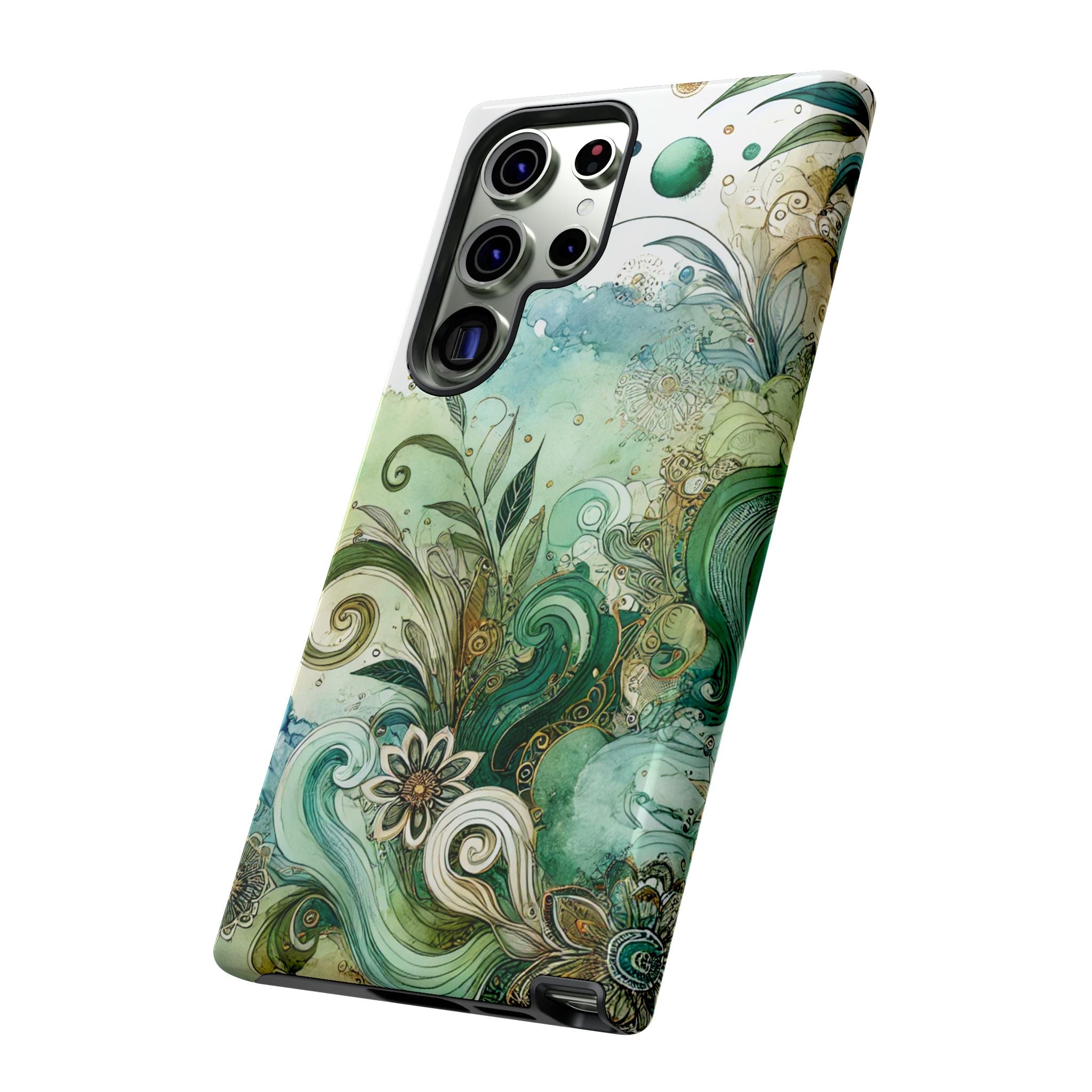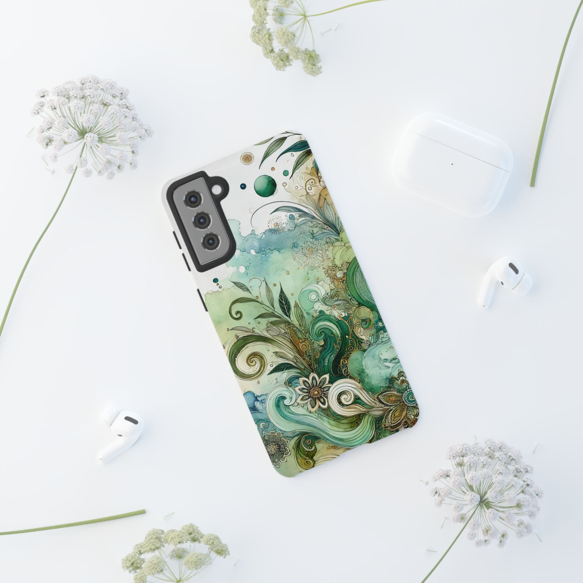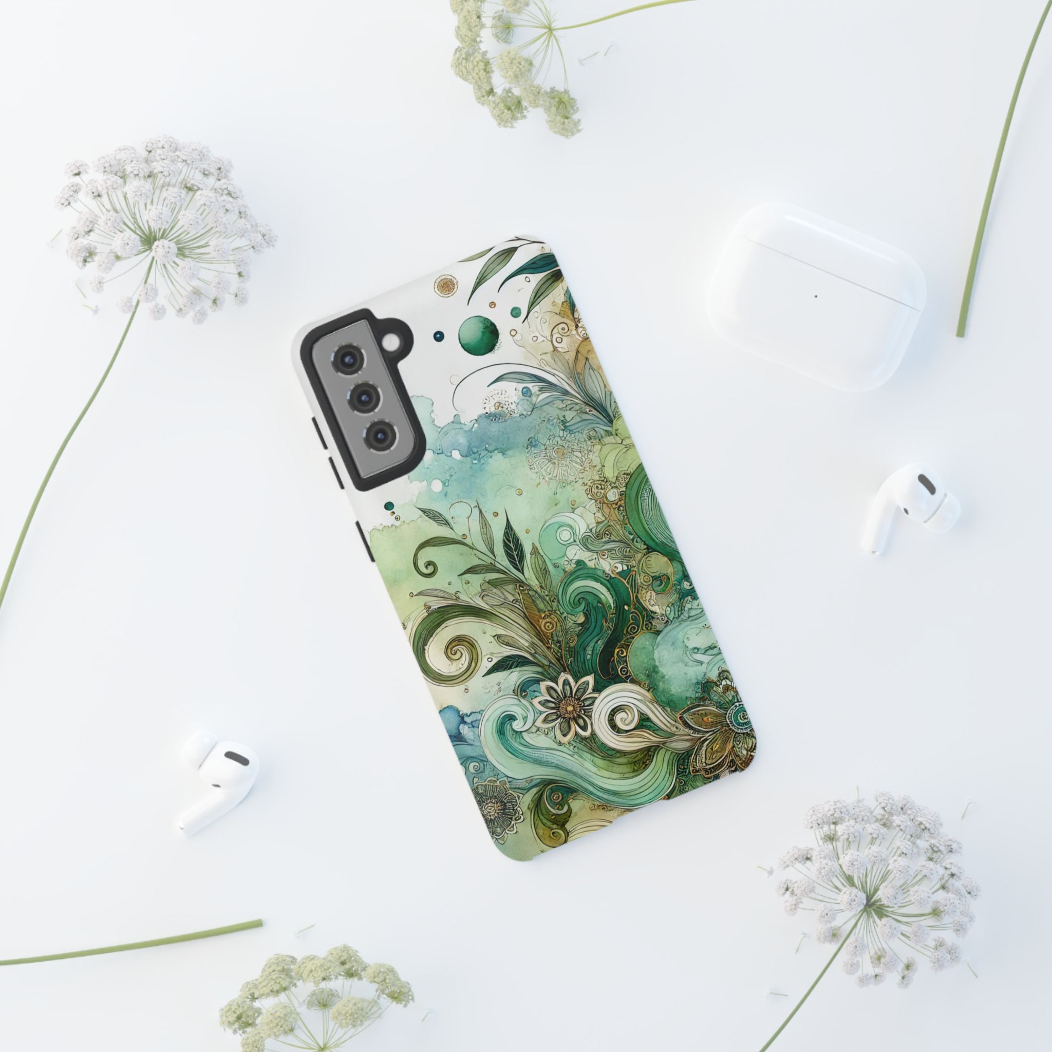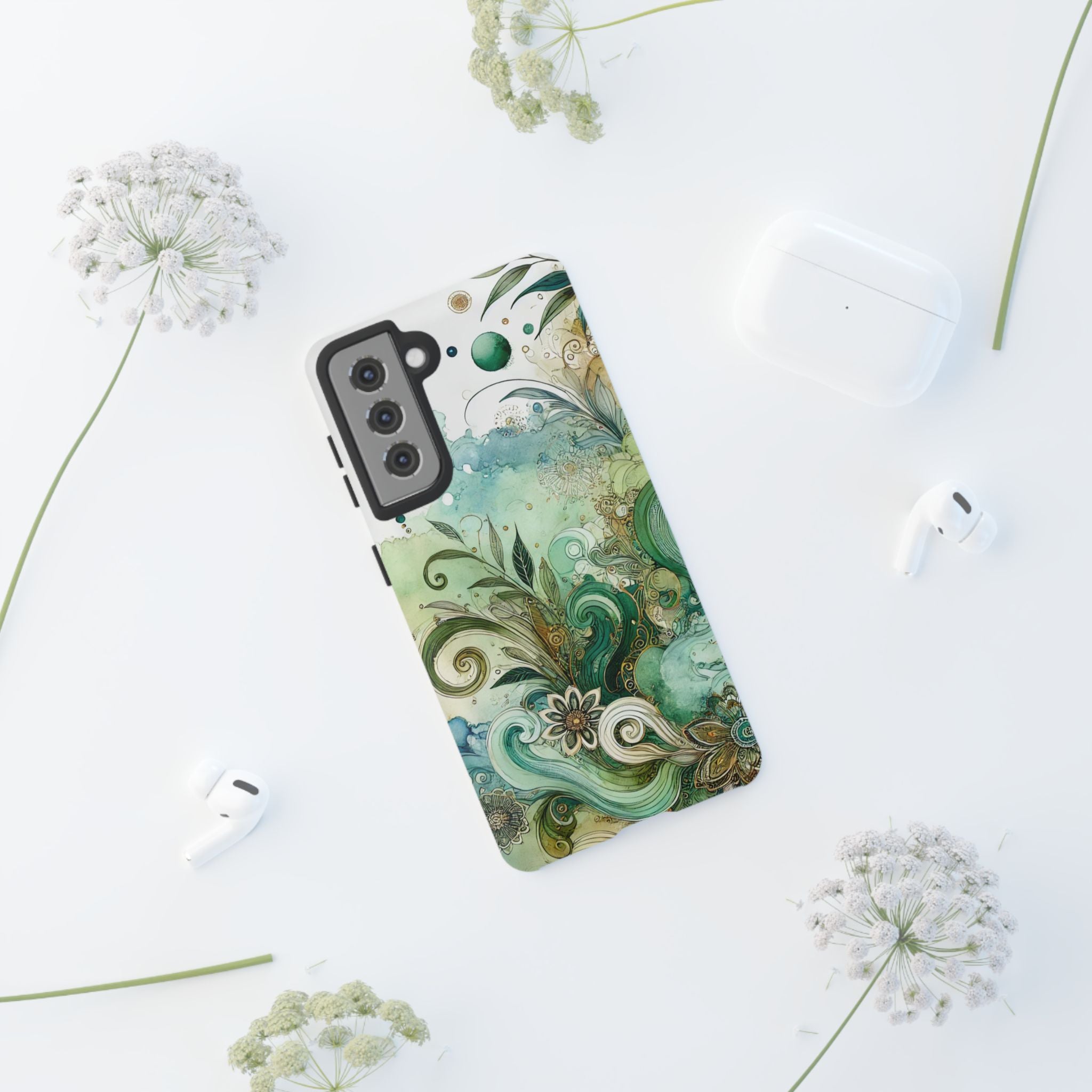 Experience the ultimate phone protection with the Tough Case - Enchantment. This beautiful case with its vibrant watercolour wash and intricate flowers in shades of green captures the essence of enchantment. The design extends around the entire case and is sure to make a statement while protecting your phone with style.