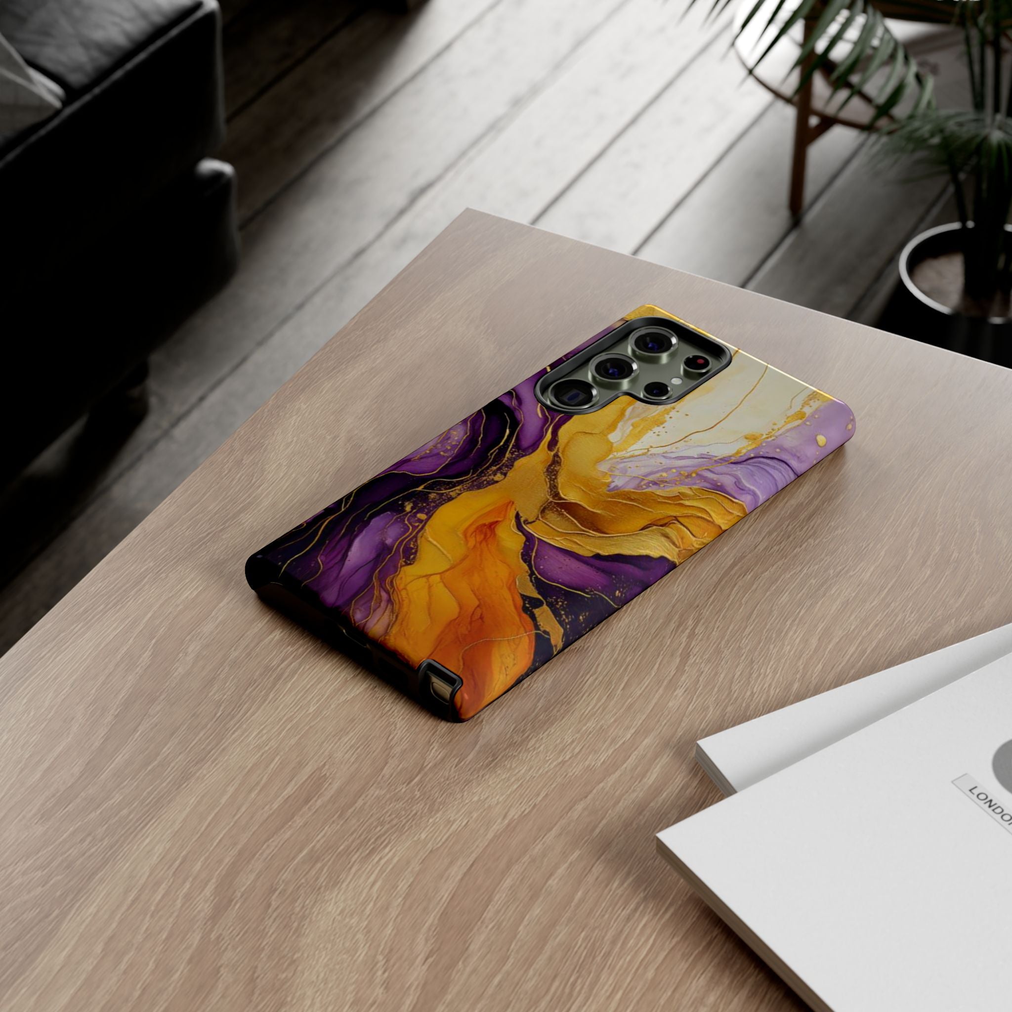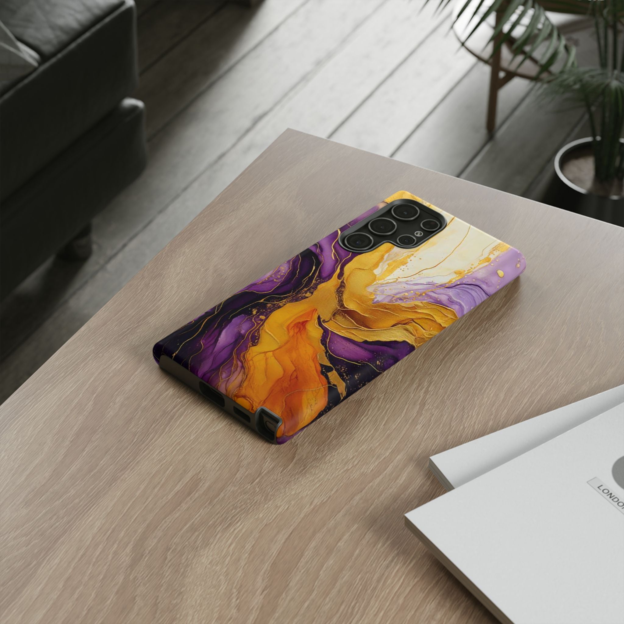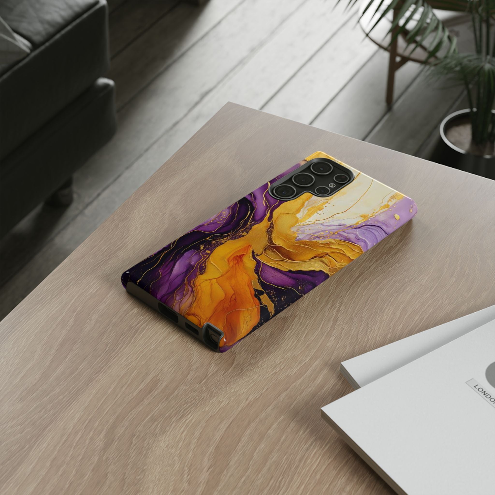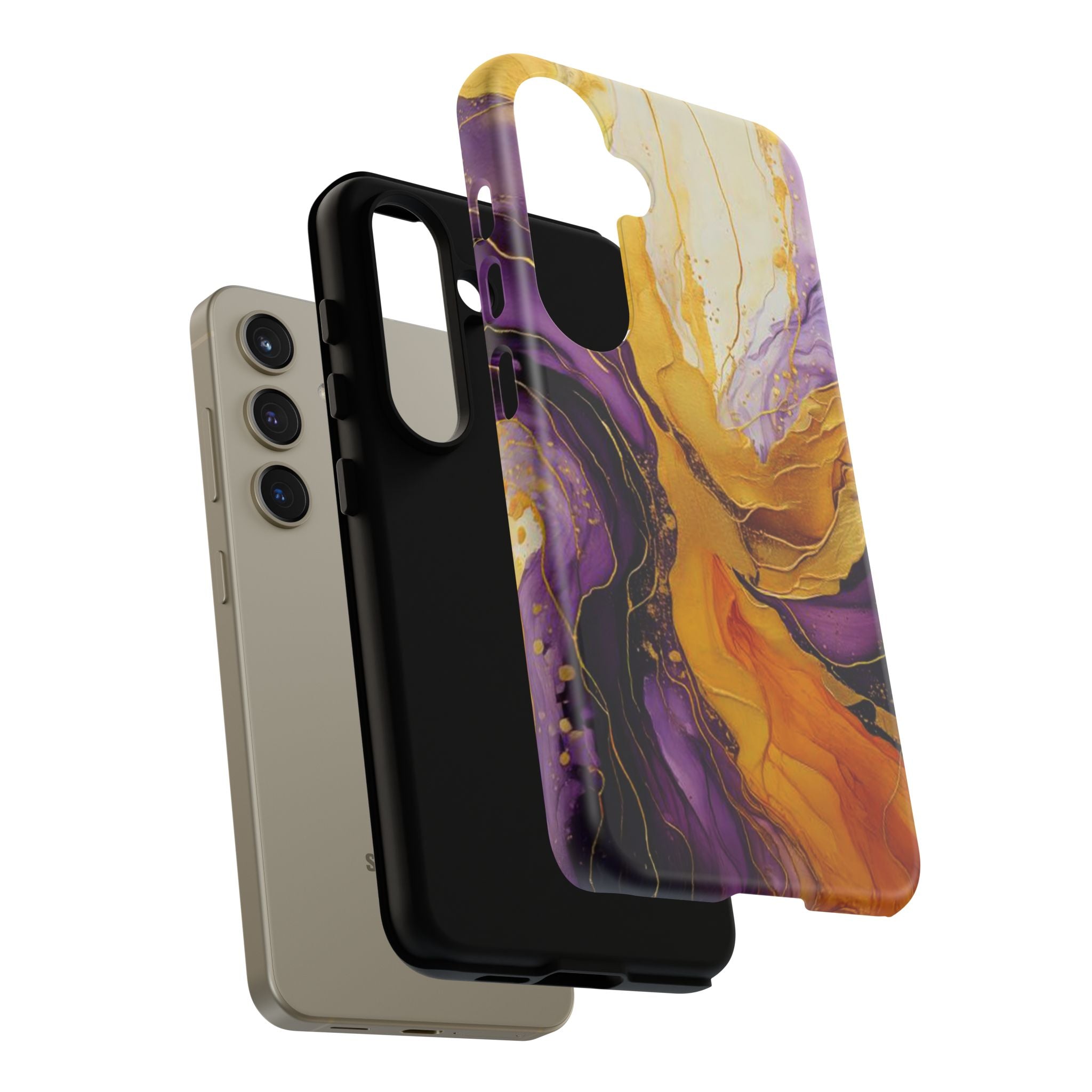Experience the ultimate phone protection with the Tough Case - Gratitude. This beautiful case features an abstract design of deep violet and golden yellow swirls. The rich hues and flowing patterns evoke a sense of appreciation and joy, making it a meaningful reminder of life's blessings.The design extends around the entire case and is sure to make a statement while protecting your phone with style.