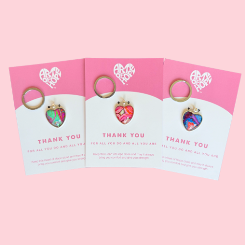 The hearts are made with love and care in our Sydney studio and each one is attached to a card with a safety pin so they can be worn on uniforms, clothes and scrubs. They also include a keyring so they can be kept close on keys and bags. Each one is enclosed in a cellophane bag for protection and there is space at the back of the card for you to write a personal message.